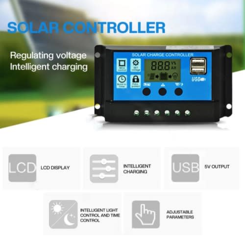 Solar Charge Controller 30A, 12V/24V Solar Panel Battery Controller PWM Solar Controller Intelligent Regulator Adjustable LCD Display Description: Type:Solar Power Meters Material:ABS+component Power:12V/24V Display Type:LCD Display Interface:Dual USB Package List: One 30A Solar Panel Battery Charge Controller PWM and manual