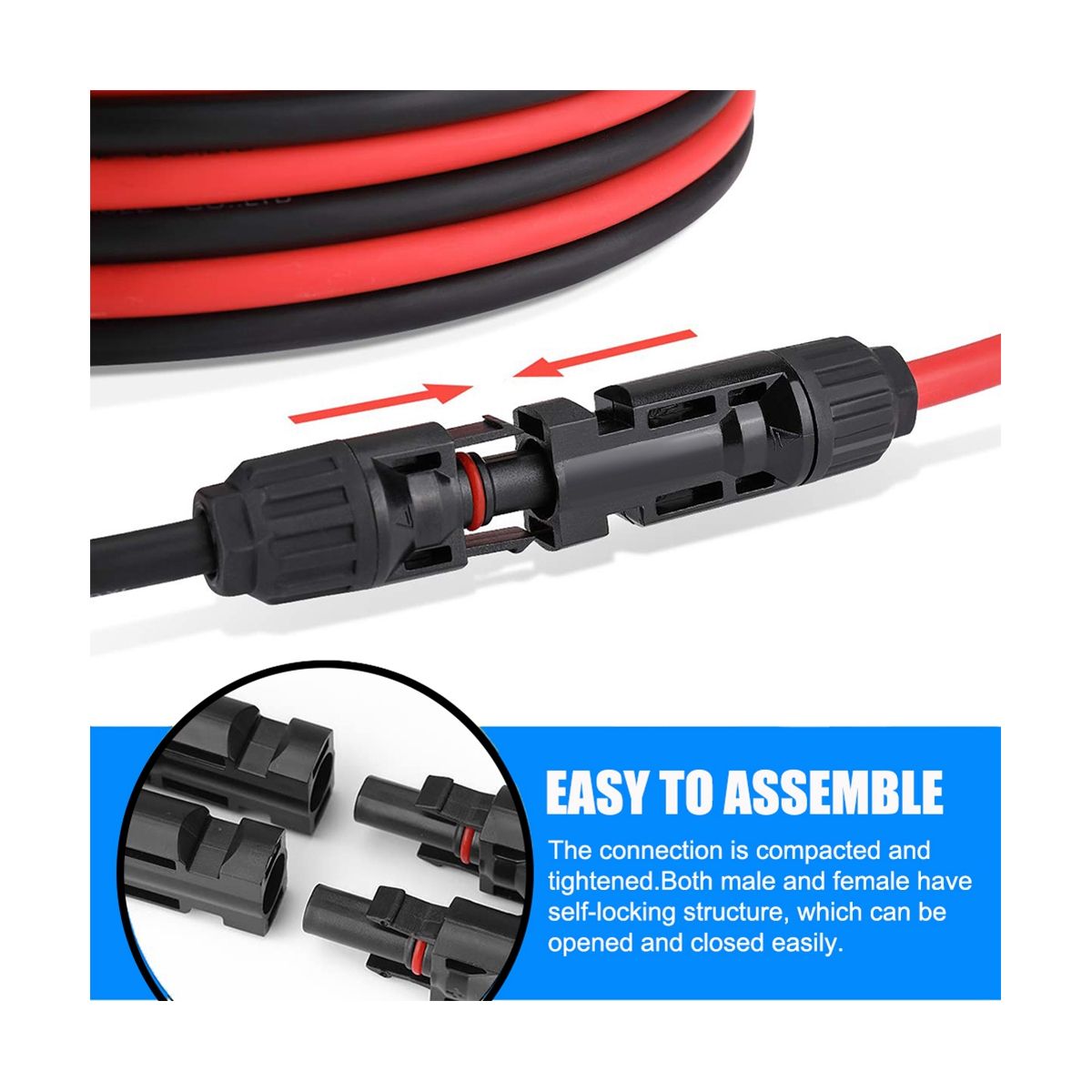 Easy Installation: Standard connectors that the connectors are secure and easy to connect or remove with any other solar cable.