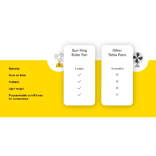 Greenlight Planet's latest product, the Sun King Fan strikes the perfect balance between performance, durability and affordability. It is designed to meet the basic cooling needs of under-electrified households around the world. The Sun King Fan has 16-inch blades which provide a powerful airflow with three Fan speed modes. It oscillates up to 90 degrees and features a built-in battery that charges directly from a 20W solar panel. The Sun King Fan has a powerful brushless motor, creating a uniquely quiet, user-friendly and flexible design.