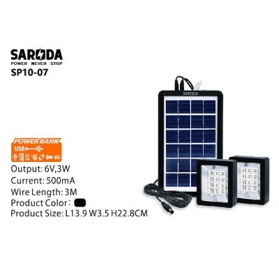 DescriptionThe LED light makes use of the built-in solar panel to absorb sunlight and change the sunlight into electricity power to recharge the built-in rechargeable battery to give off bright lightThe LED light is charged by sunlight during the daytime.With built-in Power bank USB Out to charge cellphones & comes with a 10 in 1 charging cableMain panel with built in 6 SMD LED LightFeatures2 way charging-AC 230V Power adapter and or Solar EnergyPortable & Lightweight & dimension of 117mm x 63 mm x 170 (Height x Depth x width)Shell material: durable hard plastic.Comes with a 10 in 1 USB Charging cable100% brand new and high quality Solar Powered Super Bright LED LampsLight source: White SMD LED bulbLarge 3.5 Watts solar panel with 2 Meter cable to absorb the sunlight and transform the sunlight into electricity to recharge the built-in battery.External solar panel 225mm x 140mmBuilt in Power Bank USB Out for charging DV, MP3, MP4, PSP, iPod,low power cellphones such as Galaxy Note,Blackberry 8520 etc except high powered devices such as iphone & TabletsHeadlight Lamp for emergency serch & rescueSpecificationsMonocrystalline Solar panel: 3.5W, 9Volts 0.38ABuilt-in 6 SMD LED Light6V4Ah rechargeable sealed lead-acid batteryExternal Bulb Light source: 6V 3Watts SMD LED bulb.AC 220-240V, 50/60Hz - A/C Charging time 3 hours3.5W Solar Panel - Charging time 12 hours in sunny weatherLighting time: about 10-14 hours.USB Out:5V 500mALuminous flux: 240LM.Package contents;Solar Panel -1PcLED Bulb with cable-3 Pcs