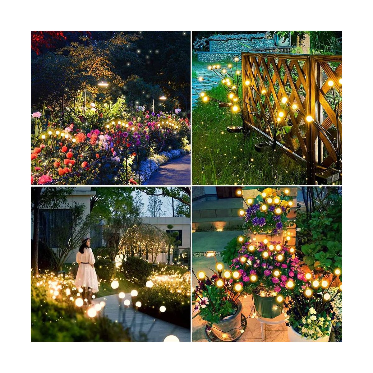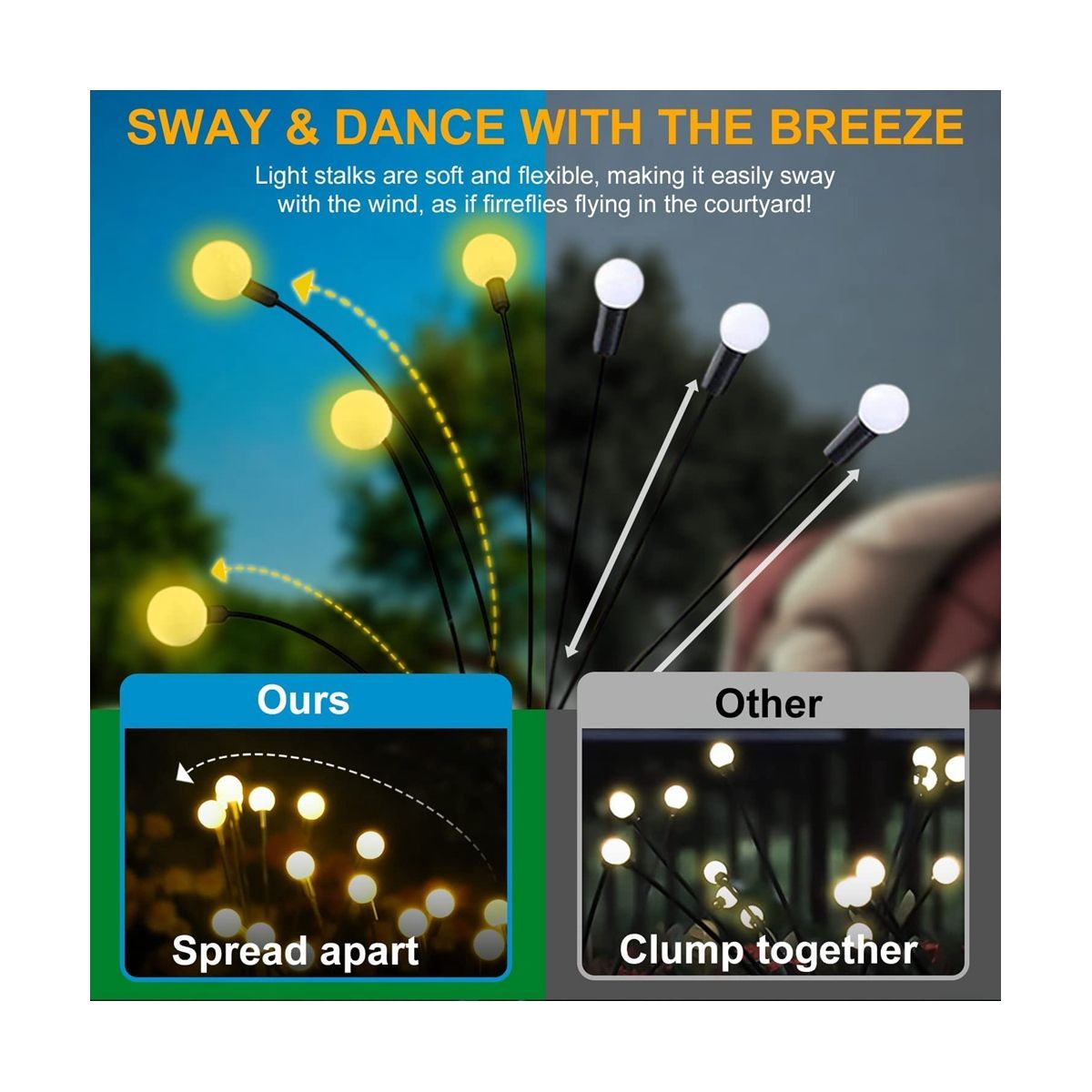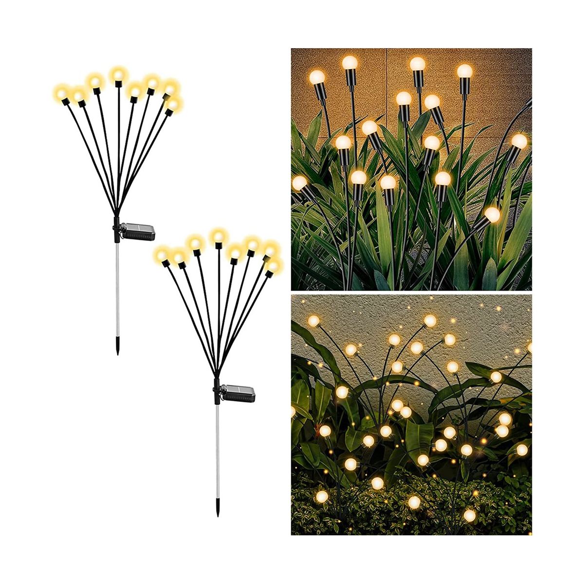 [Swaying When Wind Blows] solar firefly lights is propped by very soft & flexible wire. The warm white solar light looks like glowworms flying in the dark when wind blows, perfect garden decoration, make your garden more beautiful at night. perfect outdoor decoration for yards, yards, lawns, and sidewalks, and any occasions such as Christmas, weddings, New Year, parties, etc.