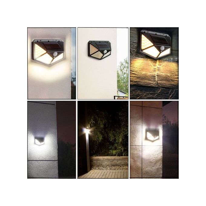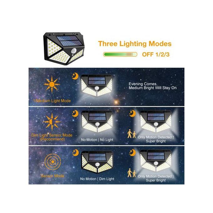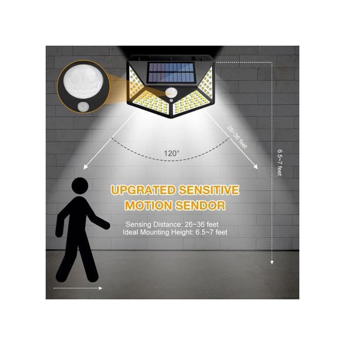 【Super Bright Upgraded LED】Equipped with 100 high powered LED beads, the solar lights gives 270 degree lighting angle, and provides a wide illumination coverage to light up a yard of 40+m².【Easy installation with Screws Only】 No need a electrical engineer to install the wall light, save your effort for cabling. This LED security light makes it so much easy and simple to put up on the wall or fence with the enclosed screws and wall plugs.【3 Intelligent Lighting modes】 Enhance active PIR motion detector with 120 degree sensing angle can detect movement within a range up to 16FT(5M). It's always one step ahead of you, giving huge support when you are back home. It brings 3 smart modes, 1.Sensor mode. 2. Dim light sensor mode. 3. Medium light stay-on mode.【High Efficient Solar Panel】 Adopted large capacity of 2200mAh rechargeable poly-crystalline silicon solar panels, the conversion rate is up to 20.5%. The lamp body is made with high impact ABS that has high-temperature resistance, anti-corrosion and IP65 waterproof, the motion sensor light can withstand all kind of weather, including heavy rain and snow, throughout the entire season with zero issues.