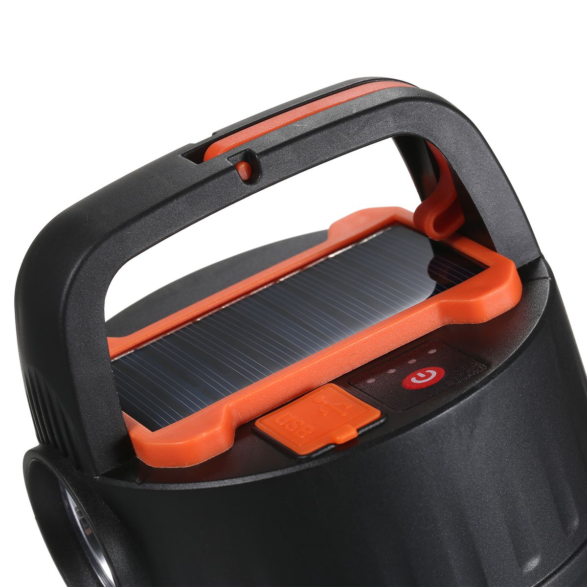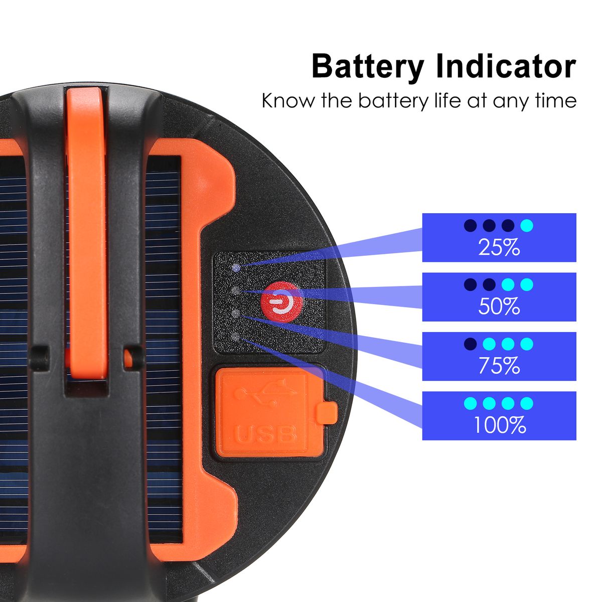 2 Methods: With built-in rechargeab-le battery and solar panel, this lantern is charged via either USB cable (included) or from the sun light. Blue indicators remind you of the battery life.