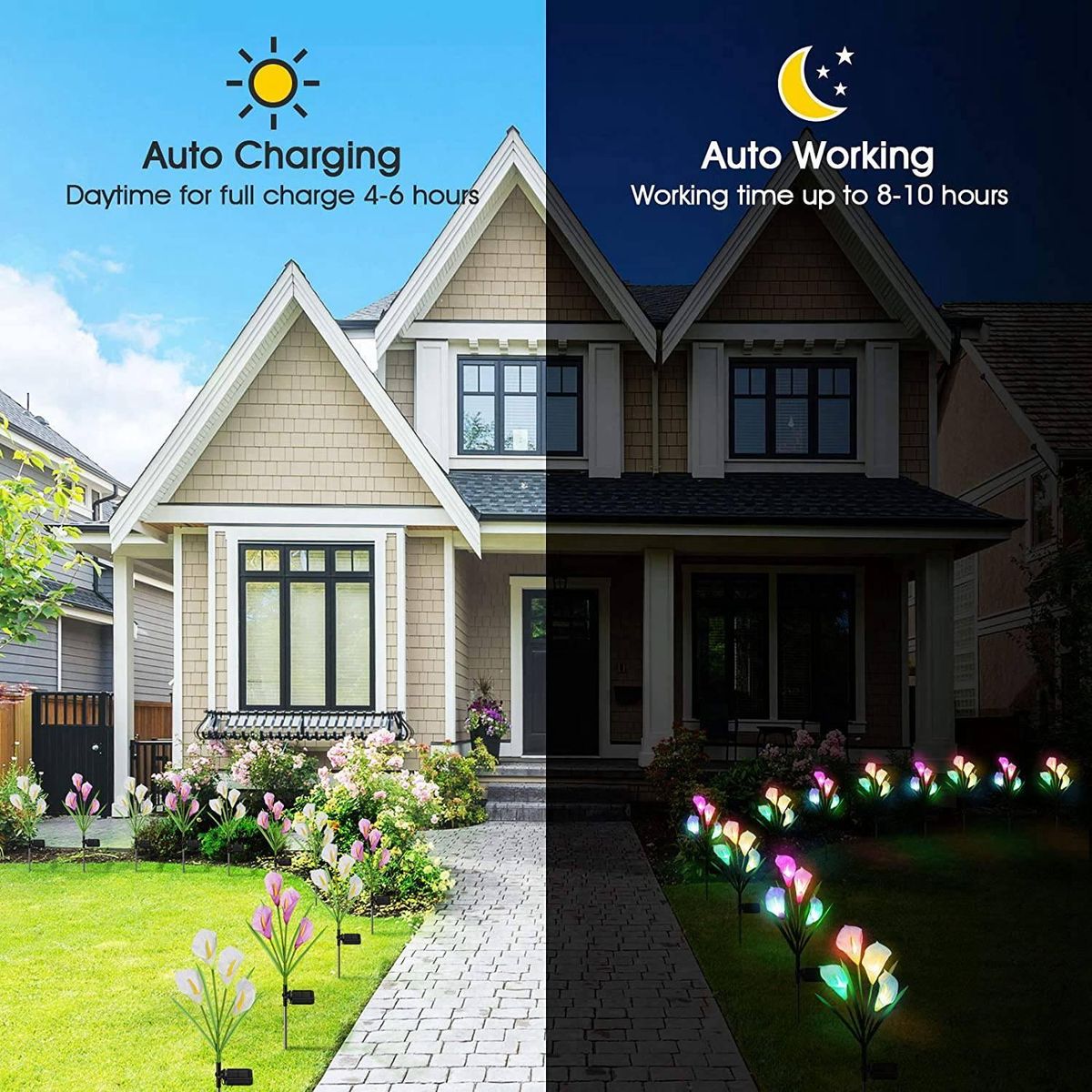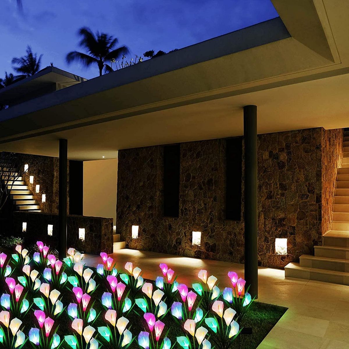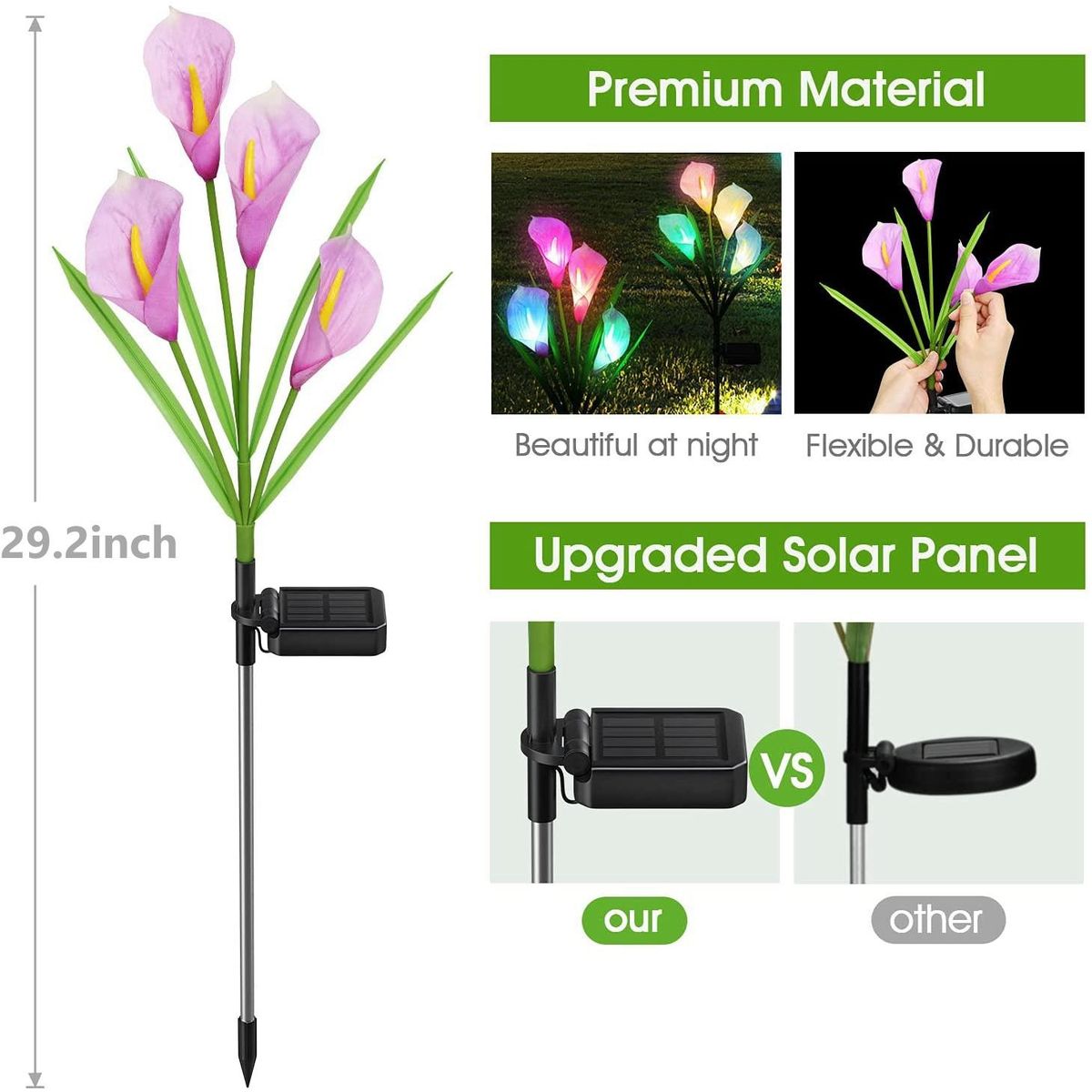 7 Color Changing Solar Lights: Solar garden lights imitating the real calla flowers, 7 color-changing solar flower lights promote the desire ambiance of any occasion, creates a romantic and beautiful changing mood while decorating with other flowers or trees at dark night, it's the finishing Press on your outdoor masterpiece, a truly great sight view for your garden yard lawn at night.