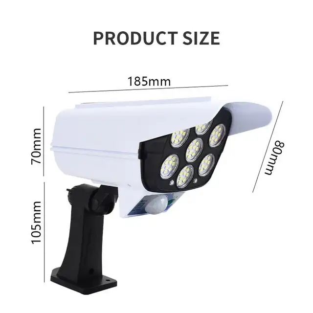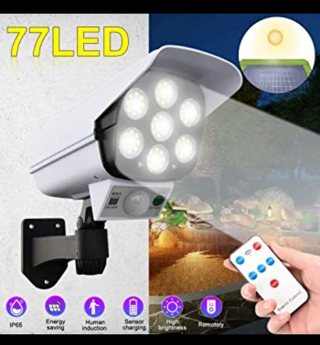 Solar Light With 77 Bright LEDs, motion-activated. Plus realistic dummy camera, when the light on at night, the small red light will flash periodically to serve as a warning.