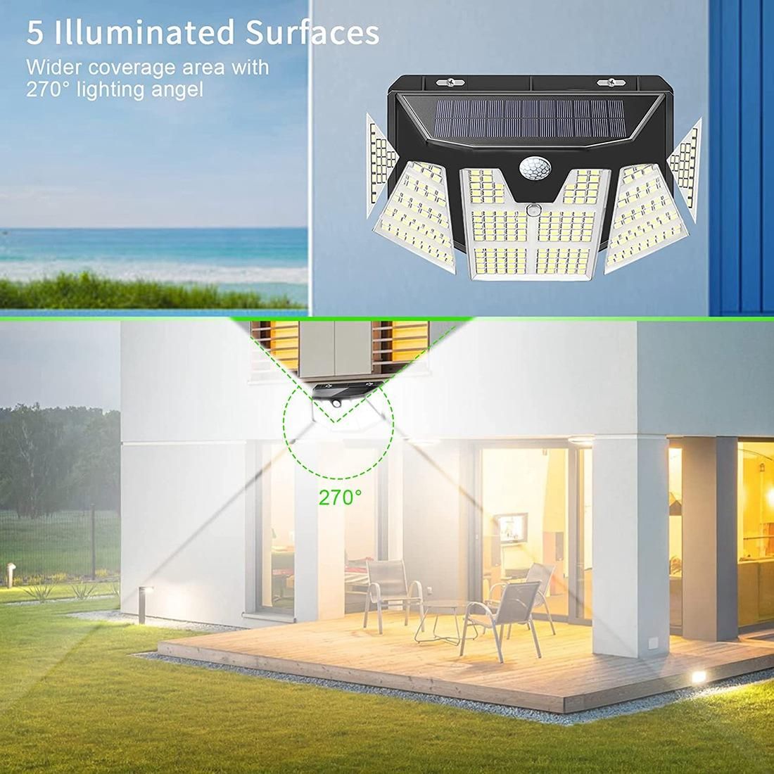 [Larger Coverage Area]Equipped with 5 illuminated surfaces and 270° wide lighting angle, these solar motion lights can provide larger illumination coverage (up to 320 ft²)