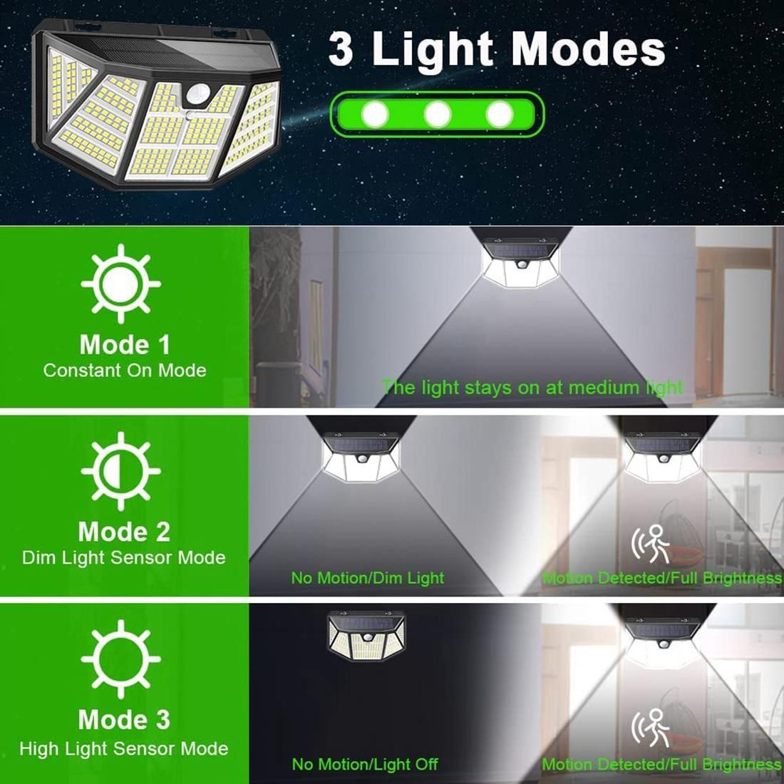 [3 Different Brightness Settings] 1. Constant lighting mode(Stays on at medium light); 2. From dim light to bright light sensor mode(Stays on bright light about 20s if motion is detected); 3. From no light to bright light sensor mode(Stays on bright light about 20s if motion is detected).