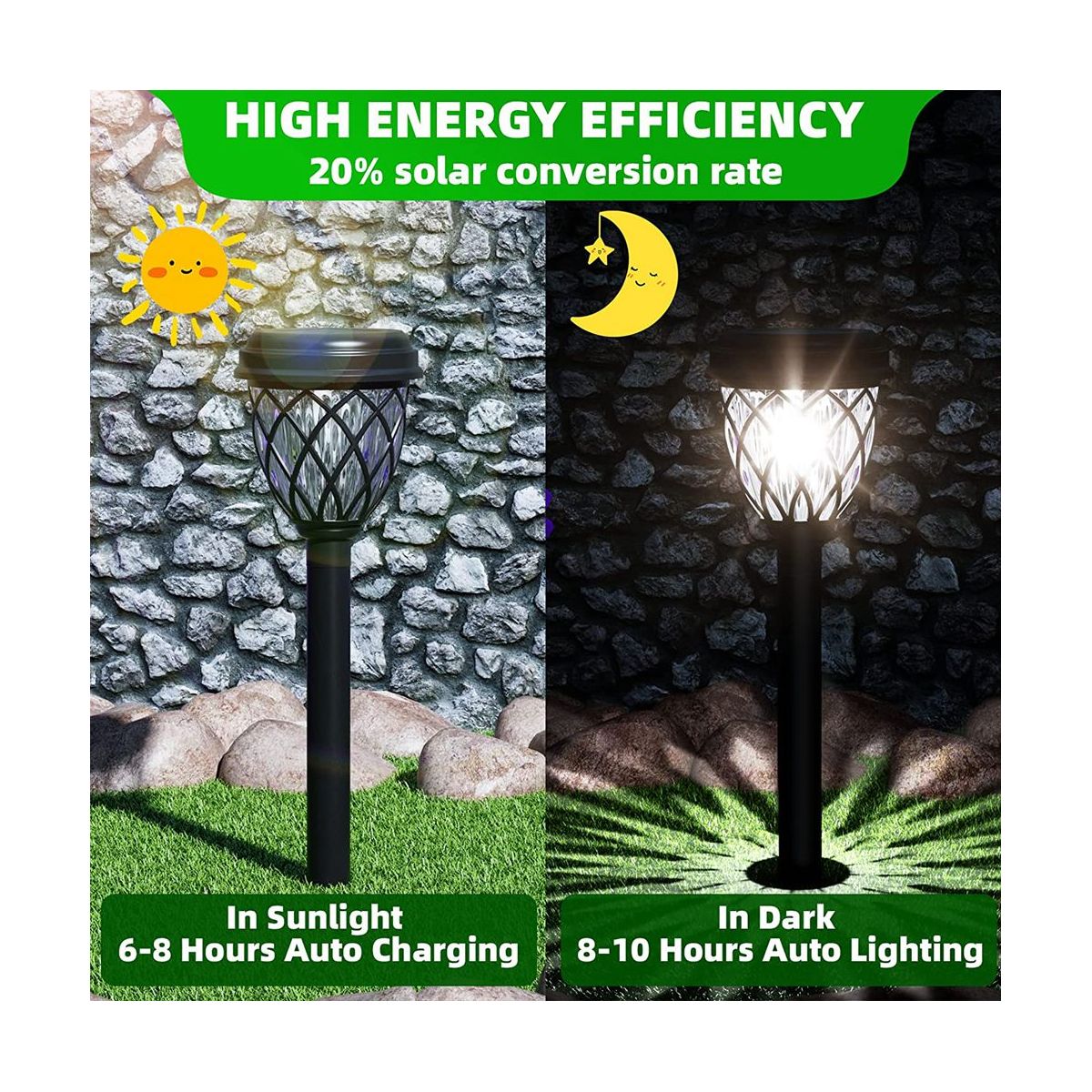 [100% Solar-Powered]Solar outdoor lights have mono-crystalline silicon solar panel that can improve solar conversion efficiency and faster charing battery. the panel solar lights of to sunlight for 6-8 hours, and it will automatically for 8-10 hours in the dark.