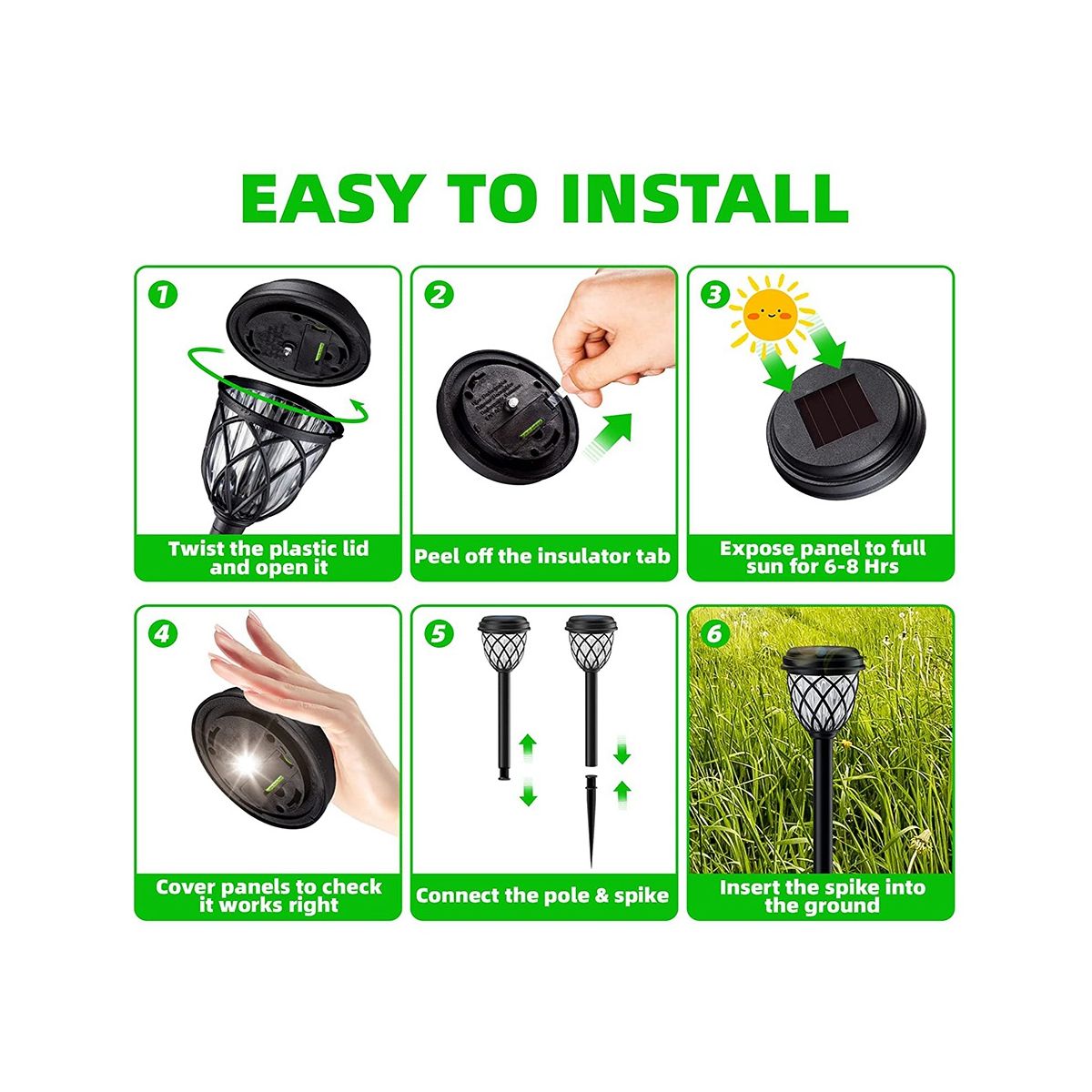 [Easy Installation & Use]Connect the parts and push the ground into the soil where there is shines, it just takes a few seconds. When you receive solar outdoor lights, off the insulator tab use then cover the panel to check whether the solar lights are working or not