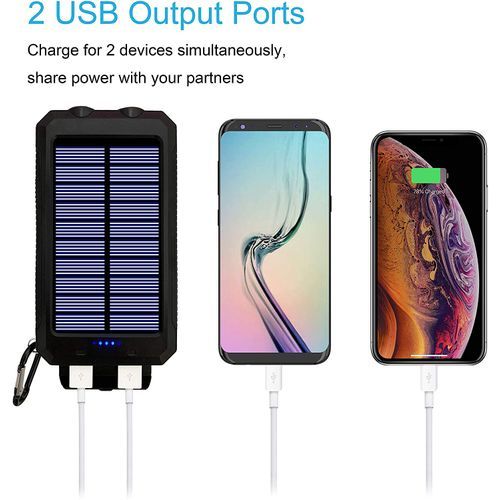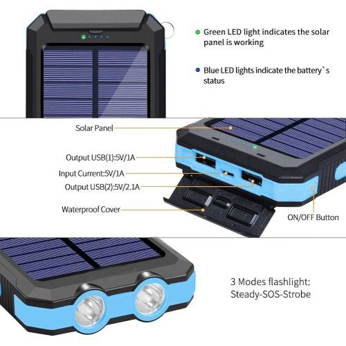 Dual USB and Powerful LED Light: Makes it easy to charge two smartphones simultaneously or a tablet at full speed. 2 led lights can be used as flashlight with Steady-SOS-Strobe mode. Five pilot indicators show the status of the battery charger timely. Greenlight on when charging by solar, blue light on when USB charging.