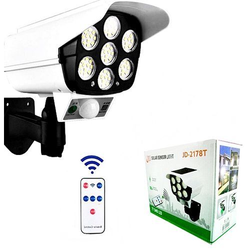 ▪【2 in 1 Solar Light & Security Dummy Camera】 - Keep your home property safe and intruders away. With 77 Bright LEDs, motion-activated, sleek Low profile design. Plus realistic dummy security camera. Detect Intruders Stay away from your household▪【3 Lighting Mode Optional 】- ① Light off at night, just red light flashing, strong light mode on when motion detected;② Weak light mode at night, strong light mode on when motion detected;③ always light on mode ,red light is always flashing on any mode▪【Long Time Working with battery】 - The security light with 2400mAh battery can offers up to 8 hours using time , additional solar panel for wire-free easy installation and absorbs solar energy under sunlight, environmental and power saving▪【Built-in PIR motion sensor】- The light will be automatically triggered when motion is detected at the distance of 10ft - 30ft, range of 120 degrees in the night. Perfect for garden yard lawn patio garage porch driveway landscape security. Make your life more convenient▪【Adjustable and easy to install】- The solar light is pretty easy to be installed. And the rotation can adjust the optimal illumination angle and solar panel angle with easy, IP65 waterproof perfect for outdoor useSpecification:--battery:18650 2400mah lithium battery--77led/2835 SMD white light+1 led red light--solar panel:5.5v/300mAh--material:ABS--waterproof:IP65 Note: Not a Camera, its a led light