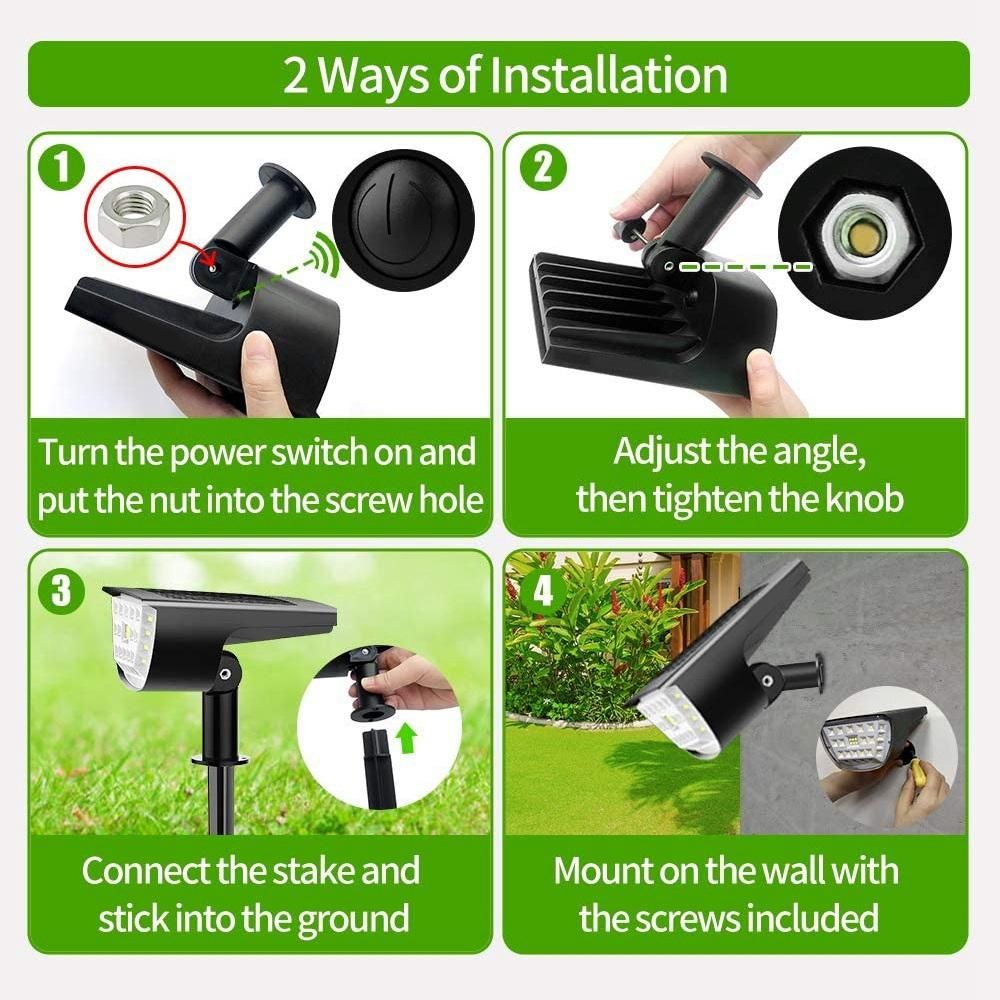 Detailed Information About The Product:Upgrade solar Brighter 32 LED lights, 1200 and wider 150° illumination angle and 90° adjustable solar panels, working time. Compared with other 8 or 12 LED solar spotlights on the market, solar landscape lights are more unique, and practical.