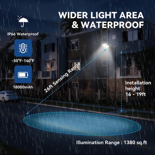 Super Bright: 120 Super Bright LED,Produce over 6000 lumens to provide lighting and security to your garage, pathway and more.Smart Sensors: Light sensor and smart body sensor, Linear sensing distance can reach 8-12 meters, strong anti-interference. When man come, the sensor will sense the man and turn to the super bright model, when man left, the light will turn into the slight light (half of the bright light).IP65 Waterproof: The IP65 waterproof class allows you to install optionally in any corner of the room or outside, It can also withstand all kinds of severe weather conditionsEnergy Saving: 6V12W high quality solar automatic photovoltaic charging. Charging time: 6-7 hours. The lamp is powered by solar energy and you don't have to pay the electricity bill for it; It's really energy efficient and environmentally friendlyEasy To Install: Simply mount it to any hard surface (fence, pole, wall, and tree) under direct sunlight and turns on to provide light anywhere you need it, such as road courtyard garden etc.