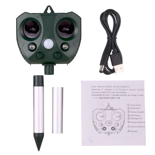 Solar & USB Powered --- Animal expeller with a large solar panel, which can be continuously charged by sufficient sunlight, or use USB cabel for insufficient auxiliary when solar is not enough to provide excessive animal activity.