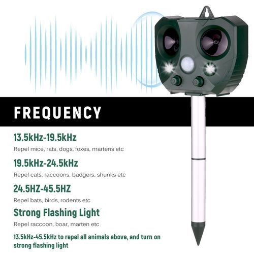 Features: Ultrasound & Strong Flash --- Powerful ultrasound matched with strong flash, humanitarianly drive away unwelcome wild animals, protect your life from being disturbed. Adjustable frequency and sensitivity can help control different size of animal.