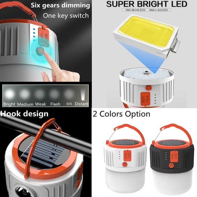 Instructions & Features:1.Portable Solar Panels charging/USB charging Outdoor Smart Lanterns/Hooking Lights,Garden Landscaping lamp,Low energy consumption.Convert light energy to electrical energy,Stored in a large-capacity lithium battery.IP65 Waterproof,Heat-Resistant,Frost-Resistant.2.Super Bright Equipped with 42pcs strong light LED wick upgraded high power LED and newest energy management Intelligent control chip,Energy saving.3.Remaining battery power display function,Real time power display,dazzling blue light,clear at a glance.All indicator lights are on Indicates the full power state.4.Simple streamline aesthetic design,Built-in LEDs Wide-angle Lighting Design,Light illumination range can be improved up to 360 degrees Wide Angle Bright light.5.Constant current lighting,Six gears dimming.Built-in battery Provide a steady flow of electricity.Bright/Medium/Weak/Flash/SOS/Distant irradiation,Six mode gears dimming to meet the lighting needs of different scenes.6.Solar Smart Lanterns/Hooking Lights can be widely used for garden,Landscaping Patio,Pathway,Decorative,patio yard,deck garage,driveway porch in all weathers.7.Applicable scene just as Night market stall,Night work,Power outage emergency,Outdoor lighting,Stadium lighting,Night fishing etc.8.EMERGENCY CHARGING,With USB POWER OUTPUT port,it can supply POWER to other small appliances that support USB input port,such as mobile phone,Bluetooth speaker,MP3,etc.