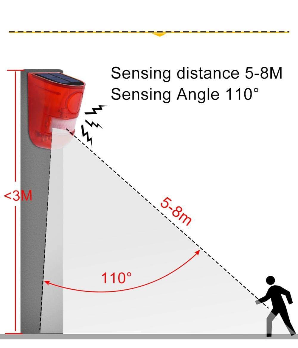 Modal induction angle 110 degrees, solar light about 6 hours full of electricity, a charge can be used 24 hours a day for 30 days of ultra-long duration, 365 days continuous , no -consuming alarm lights.