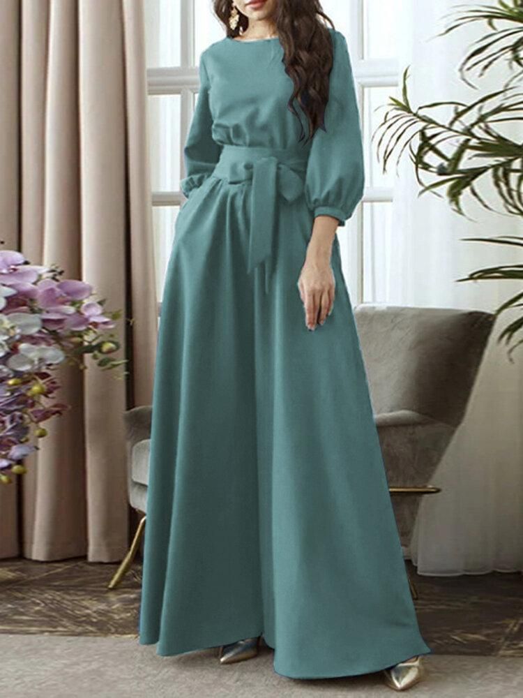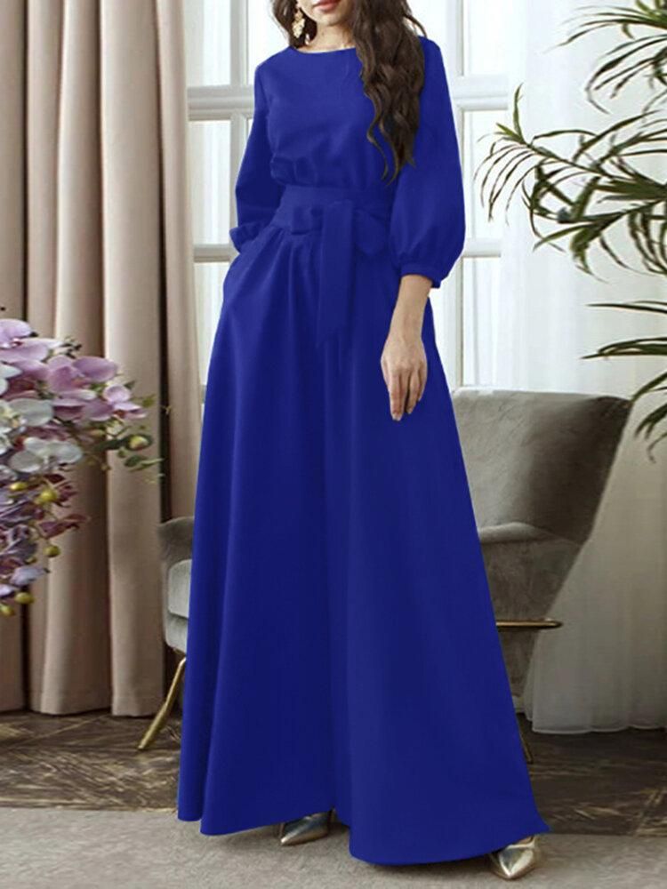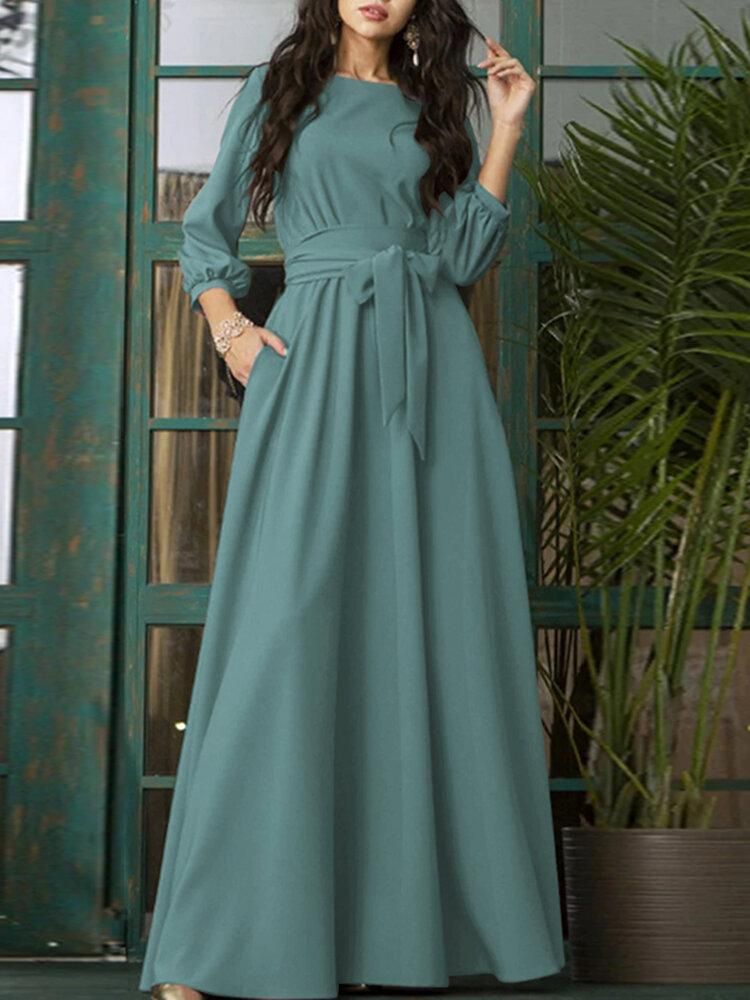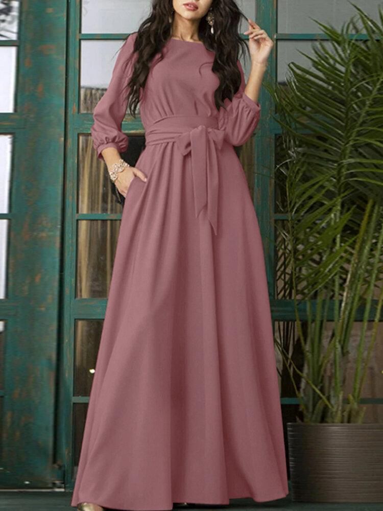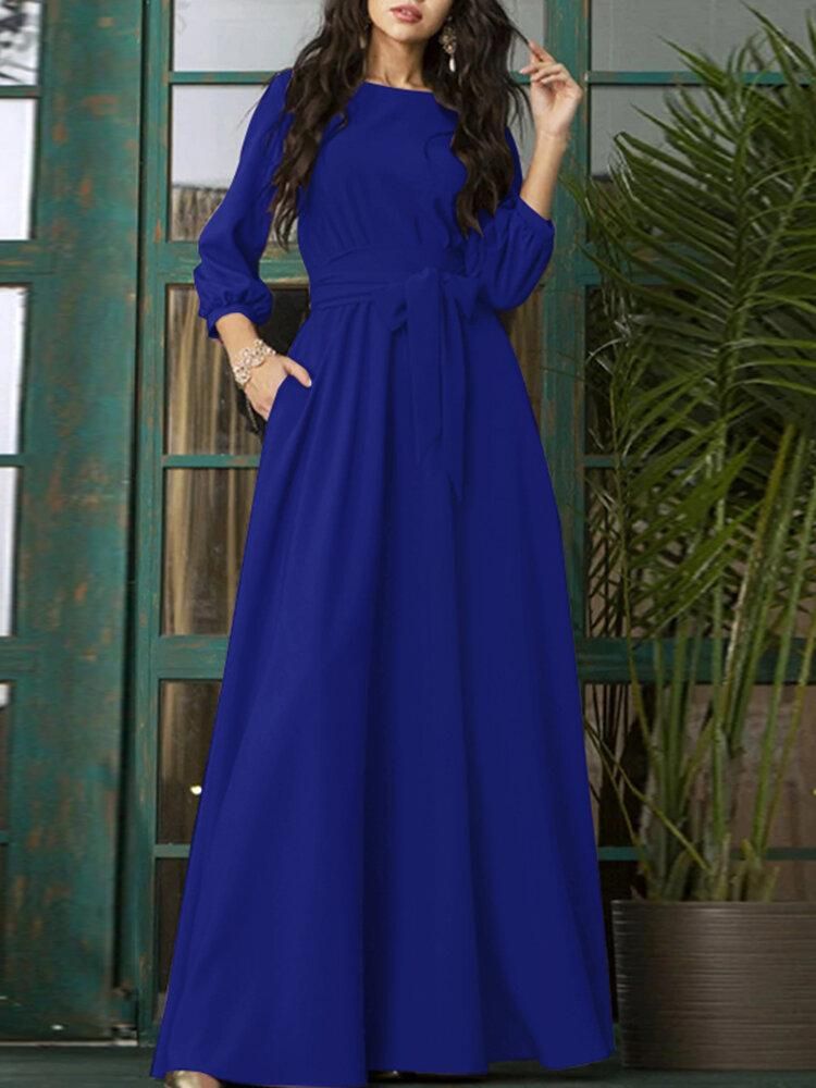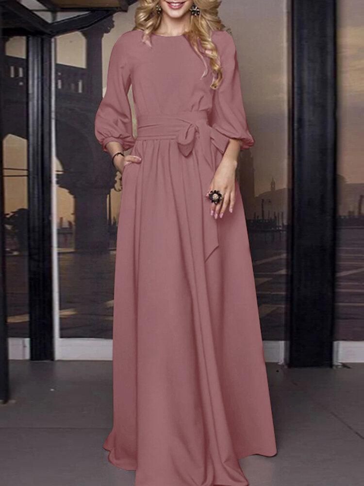 Buy Solid Color Belted O-neck Lace Up Side Pocket 3/4 Sleeve Vintage Maxi Dress in Nigeria