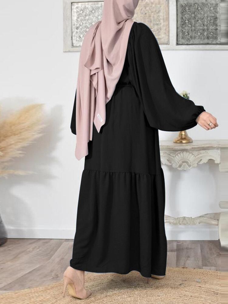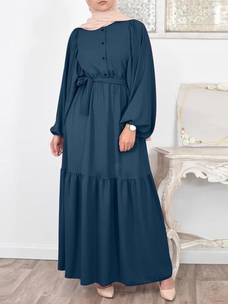 Buy Solid Color Puff Sleeve O-neck Maxi Dress With Belt in Nigeria