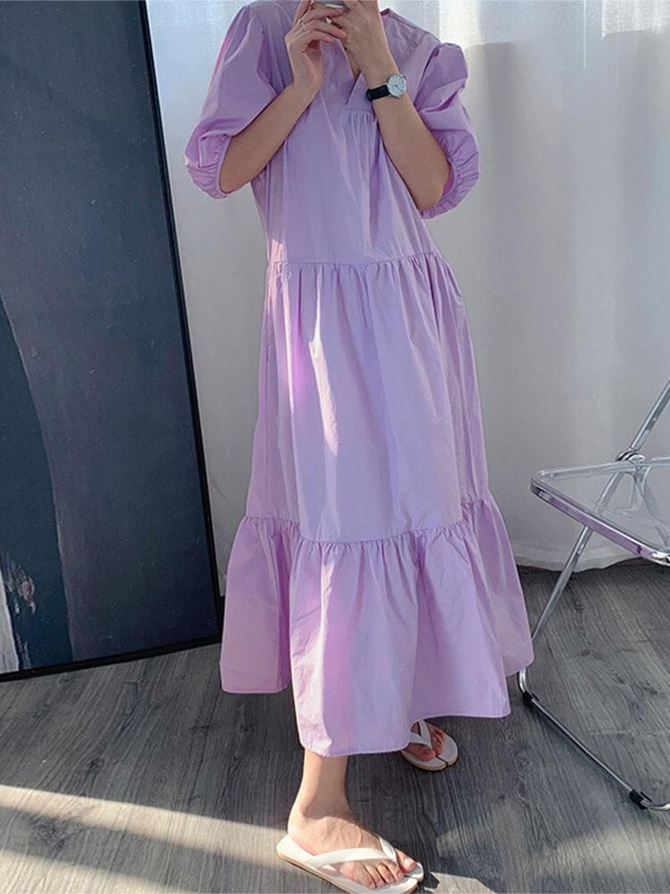 Buy Solid Color Puff Sleeve Pleats Ruffle Hem Holiday Maxi Dress in Nigeria