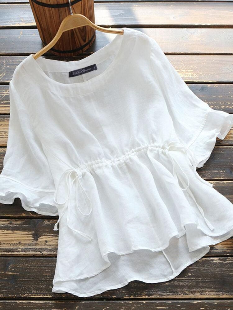Buy Solid Drawstring Ruffle Sleeve Round Neck Casual Cotton Blouse in Nigeria