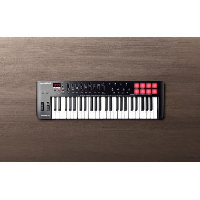 The Oxygen 49 MKV features two banks of eight backlit velocity-sensitive trigger pads with Note Repeat for beat production and finger drumming. There are eight assignable knobs for controlling virtual instruments and plug-ins, and nine assignable faders for mixing your productions with precision and ease. Ergonomically designed pitch and modulation wheels along with a 1/4" sustain-pedal input provide you with additional control over your music and performance. A set of transport buttons enables you to control your DAW without having to reach for the mouse.