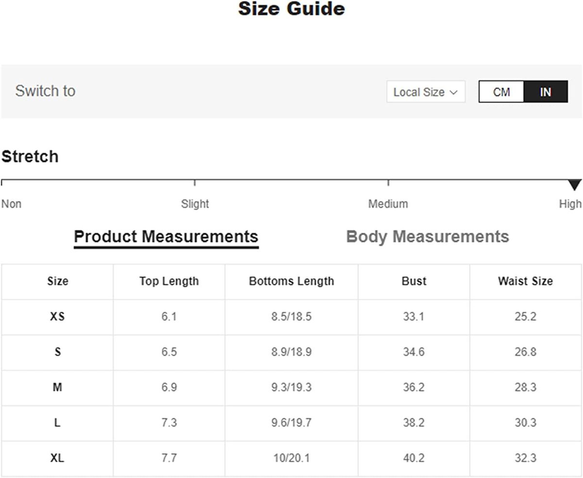 Size Chart:X-Small: Top Length: 6.1", Bottoms Length: 8.5/18.5", Bust: 33.1", Waist Size: 25.2", / Small: Top Length: 6.5", Bottoms Length: 8.9/18.9", Bust: 34.6", Waist Size: 26.8", / Medium: Top Length: 6.9", Bottoms Length: 9.3/19.3", Bust: 36.2", Waist Size: 28.3", / Large: Top Length: 7.3", Bottoms Length: 9.6/19.7", Bust: 38.2", Waist Size: 30.3", / X-Large: Top Length: 7.7", Bottoms Length: 10/20.1", Bust: 40.2", Waist Size: 32.3"