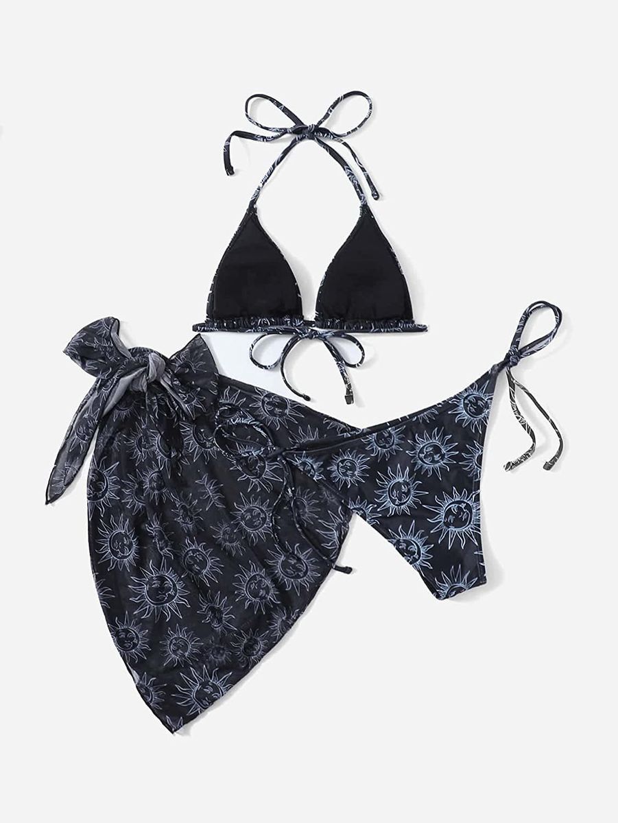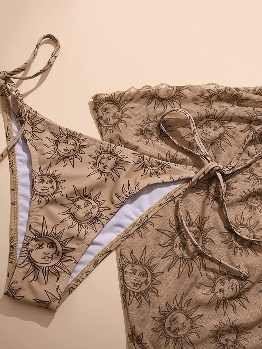 - Feature: Halter, triangle top, tie back, sun print, tie side bikini, beach skirt cover ups, fashionable