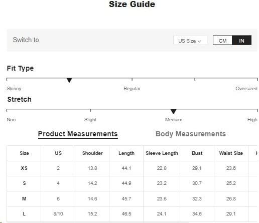 X-Small: Shoulder: 13.8", Length: 44.1", Sleeve Length: 22.8", Bust: 29.1", Waist Size: 23.6", Hip Size: 31.5", Cuff: 6.7", Bicep Length: 9.7",