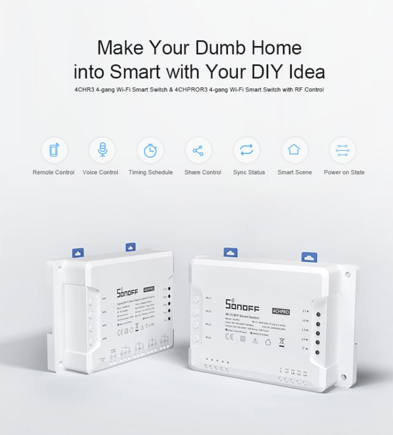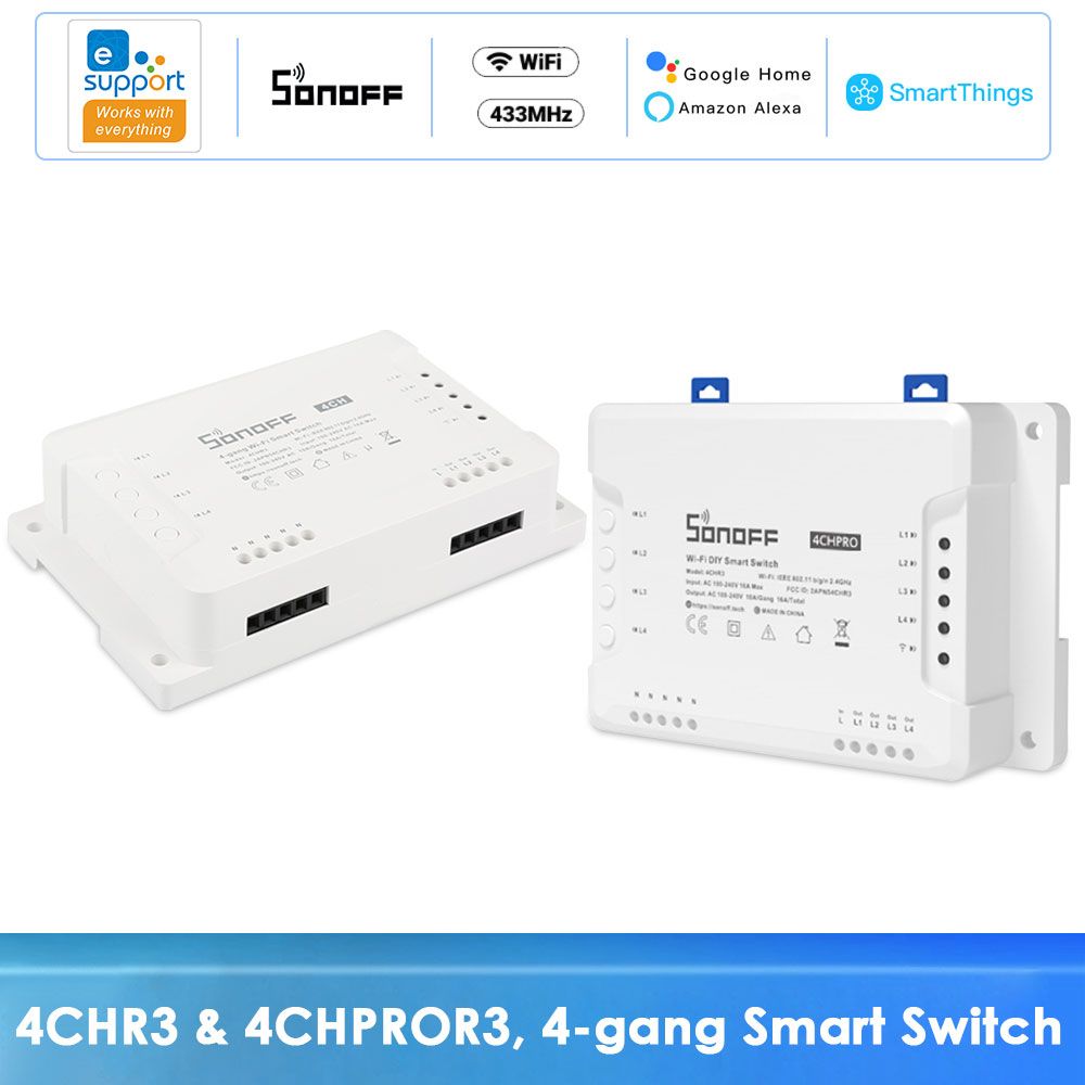 SONOFF 4CHR3 & 4CHPROR3 are both 4-gang Wi-Fi Smart Switches designed to give you the ability to integrate smart control into your existing home to enable a smart home.