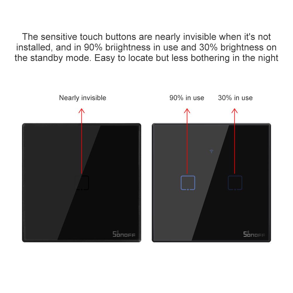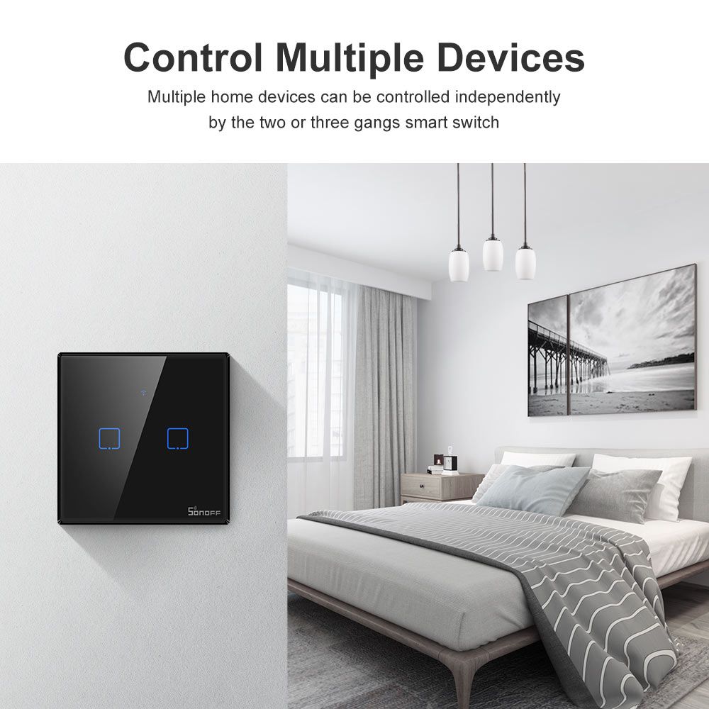 SONOFF T2/ T3 EU Wifi Smart Wall Switch can be controlled remotely using your phone, and devices connected with switches can work independently. Works with Alexa and Google Aistant which let you turn on or off your appliances with a voice command, perfect for those need to handle much housework simultaneously. A slight tap for easier control. Set a time for devices and the switches will help you turn on or off them automatically. Tailor smart scene for your appliances. simply set an event to happen to trier one SONOFF device or groups of devices with a tap on your phone. Your devices will not run because of an abnormal WiFi network, the control hence is designed to make sure they can work normally. Note 1: SONOFF T2/T3 EU support 433MHZ remote control, suest use SONOFF RM433. Note 2: SONOFF T2/T3 EU with a border, not easily damaged. Note 3: T2 is and T3 is black, pls kindly choose the color you like.