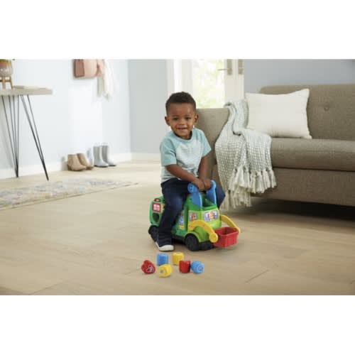 Roll into recycling! Press, scoop and load six colorful blocks into the ride-on truck; blocks store inside for easy cleanup