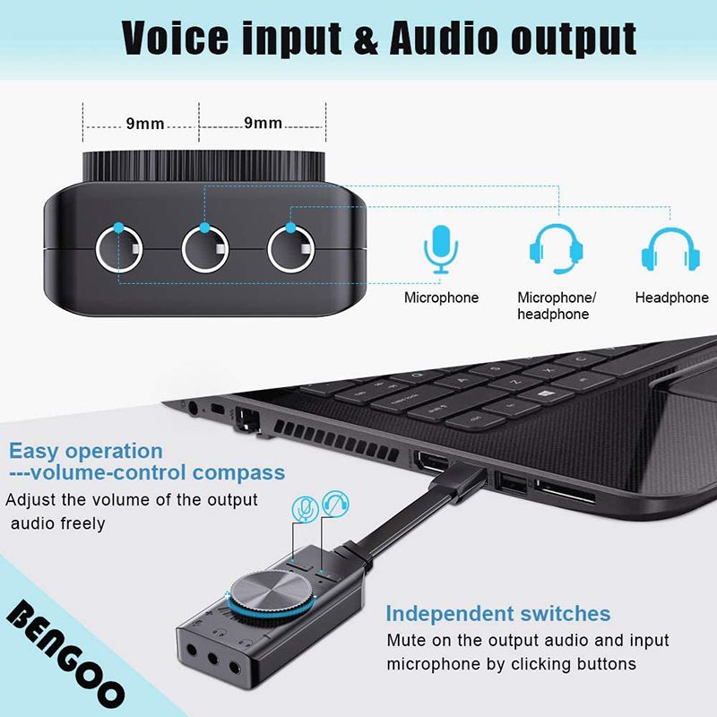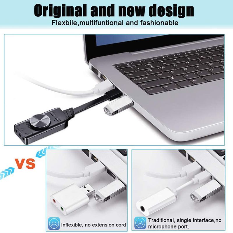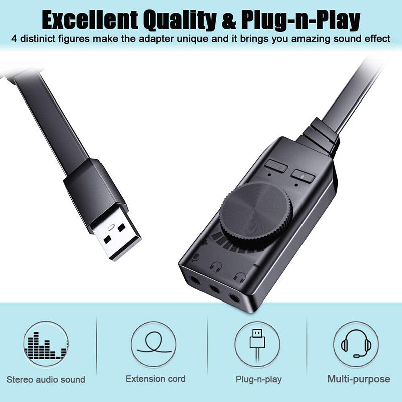 【No drivers】USB sound card is easy to use, no extra drivers is needed. Plug and play for instant audio playback. Microphone/Headphone mute design makes the headset and speaker mode switch freely without unplugging anything from the computer. Output audio sound can be adjusted by the volume adjustment wheel.