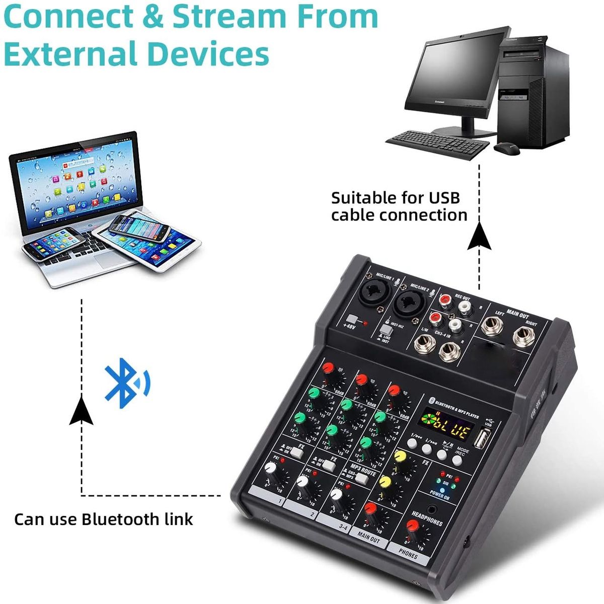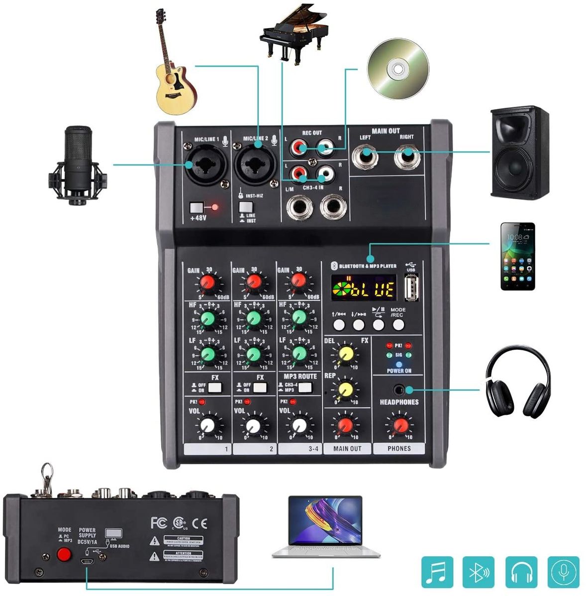 This 4-channel multi-function mixer has gain adjustment, mid/high/bass adjustment, reverb adjustment, Bluetooth/U disk function, monitor output, and connect computer as sound card.