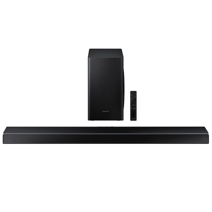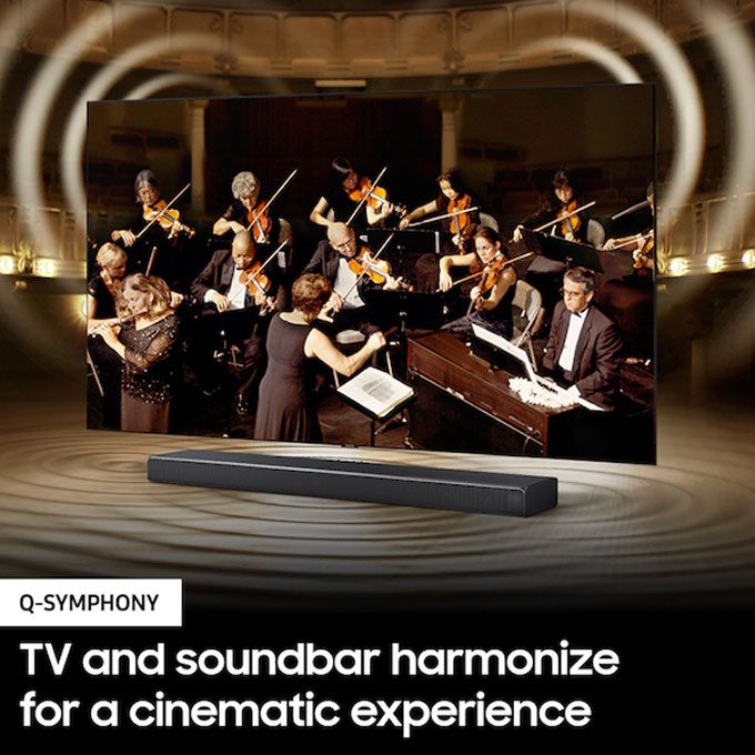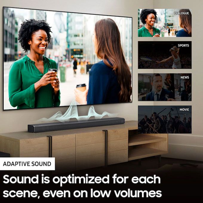 Elevate your entertainment experience with immersive 3D sound. The power of Samsung Soundbar Q60T makes surround sound come to life with speakers that fire from the front, side and above. Plus, it's perfectly matched for Samsung QLED TVs with simpler setup, matching design, and integrated sound.