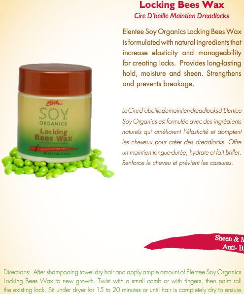 Directions: After shampooing, towel dry and part your hair into small sections. Apply an ample amount of elentee soy organics locking bees wax to new growth, twist with a small comb or fingers, them palm roll the existing locks. Sit under dryer for 15-20 minutes until completely dry.