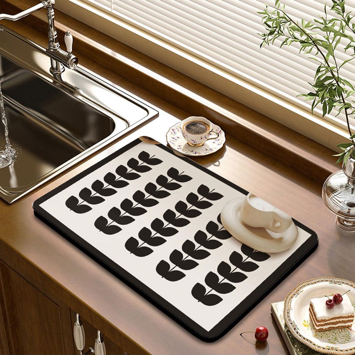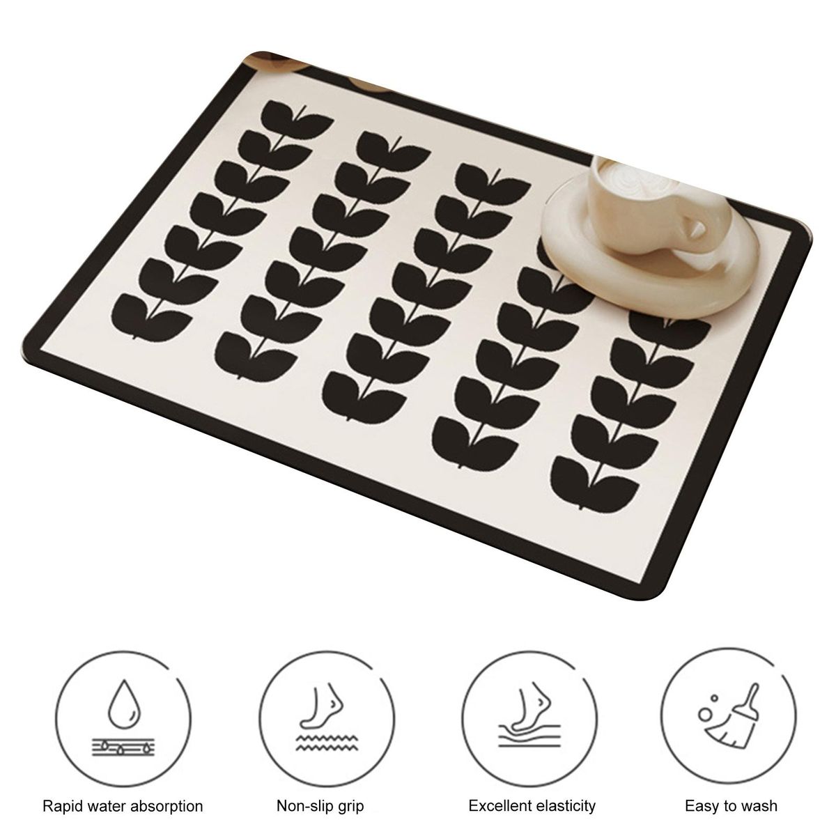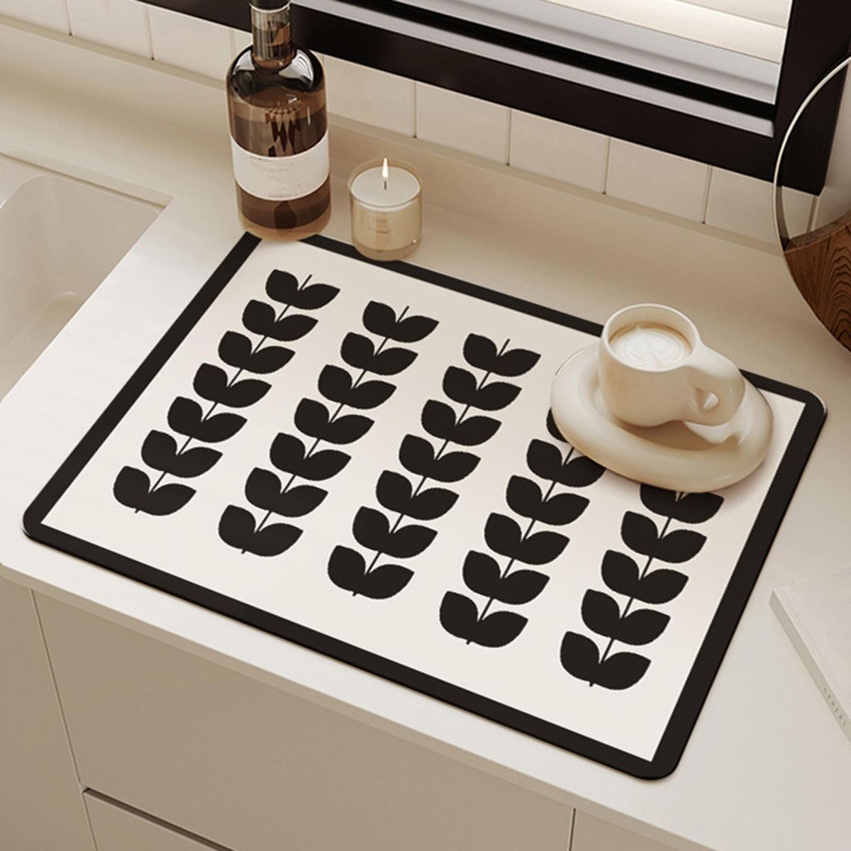 Made from absorbent leathaire, this mat quickly soaks up any drips from your dishes, ensuring that your countertop stays dry and free from water stains. it can absorb up to 2-3 times its weight in water, making it perfect for drying pots and pans too. the soft design of the mat adds a touch of elegance to your kitchen, with a stylish geometric minimalist print that enhances the overall aesthetic.