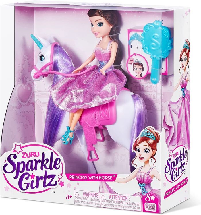 ZURU Sparkle Girlz Princess Doll with Royal Horse is the perfect playset to build your very own fantasy land! The most beautiful and sparkly Winter Princess with a majestic royal horse. You can even style your dolls hair and her horse too. Royal horse is pearlized with magical sparkly hair. Beautiful princess doll comes with an amazing dress that is removable as well as a princess tiara! Ride into a world of magic with this Sparkle Girlz set. Sparkle every day at an amazing value too!