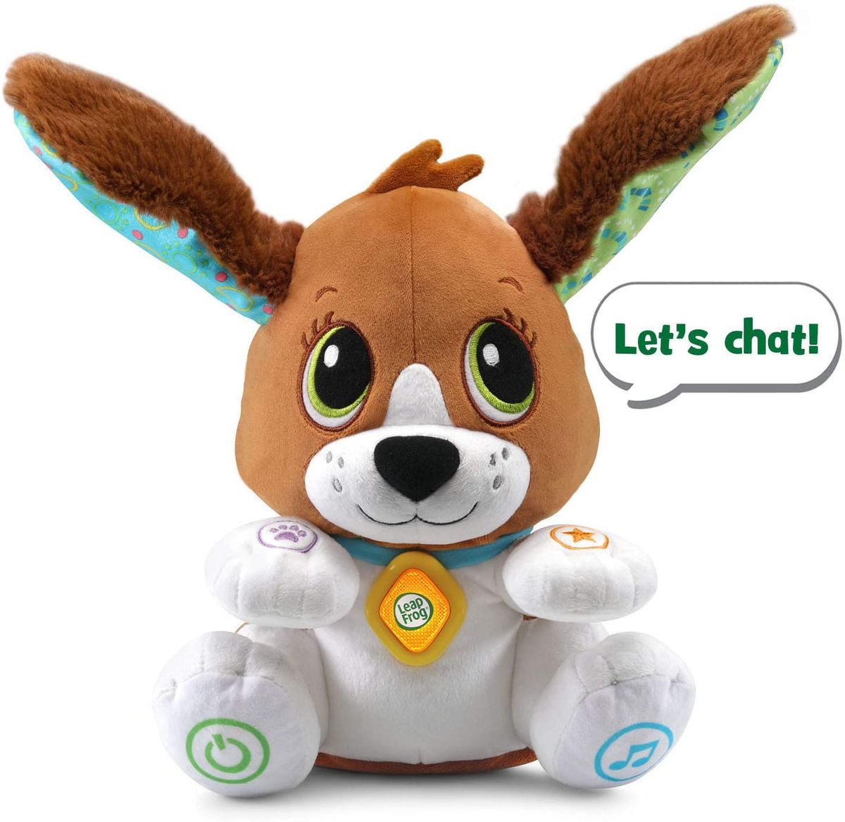 "The Speak & Learn Puppy encourages conversation by repeating what your child says in an amusing and playful voice. This fun interaction encourages back-and-forth conversation between the child and the puppy. There are three levels of language play from repeating words, to answering questions, to creating stories using their own voice.
