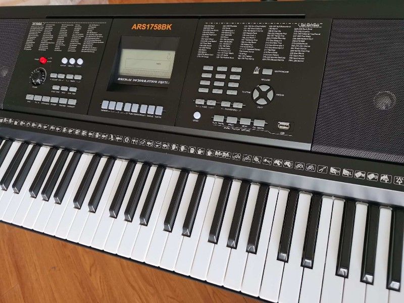 ●External power/ External earphones jack/ External microphone jack/ External sustain pedal jack/ Line output61-keys touch response piano-style keyboard/LCD display