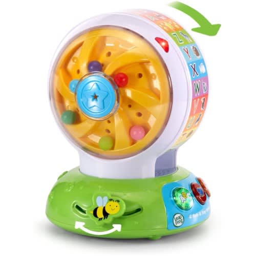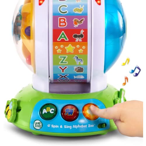 Learn about animals and letters with every spin! the alphabet zoo ball is an interactive spinning toy that features three modes of play. Your little one will have a ball as they press the three light-up buttons to learn letter names, animal names and sounds, and music. Every spin turns the inner wheel, triggering spinning balls on one side and projecting LED colors through a pattern of different shapes on the other. When the wheel stops, your child will hear either letter names or animal names and sounds. In music mode, they can sing along to the ABC song or a song about colors and shapes. Slide the Bee or press the frog and rabbit buttons to develop fine motor skills.