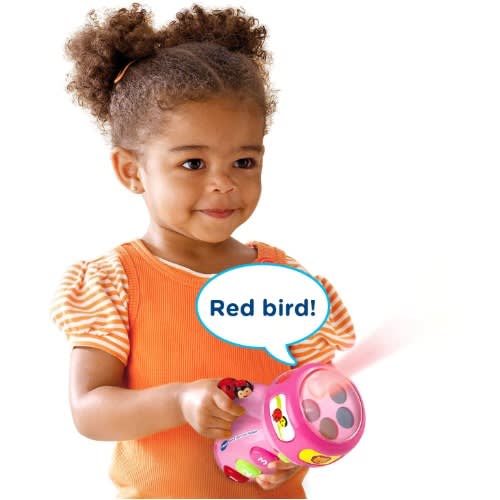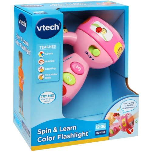 Light up and learn with the spin & learn Color flashlight from VTech. The toy flashlight excites as it glows with a rainbow of five colors and plays exciting songs and music. Change the colors and listen to five fun animal sounds as you spin the dial and learn about colors and animals. Press the engaging ladybug button to hear phrases and sounds that teach numbers to playful melodies or Count along and learn the numbers 1, 2, and 3. Over 50 sing-along songs, music, sounds, and phrases engage learning fun. With its easy-to-grip handle, your toddler will want to take this learning toy flashlight with them on every adventure.