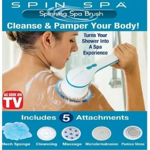 The all-new Spin Spa is a cleansing shower unit that rejuvenates your skin and pampers your body with a series of gently rotating heads. It features a long handle that even makes reaching your back & lower legs so much easier! No more stretching or struggling to clean difficult parts of your body.Spin Spa works with your favourite soap or body wash to easily clean & revitalize your skin! Simply add soap, then attach one of five interchangeable heads and you can help clear away dead skin cells helping to reveal your silky skin underneath. Switch to another head for gentle exfoliating, callus removal or soft massaging that can help with circulation for tired, worn-out achy muscles. After your shower, you'll feel like you've just finished an amazing day at the spa!