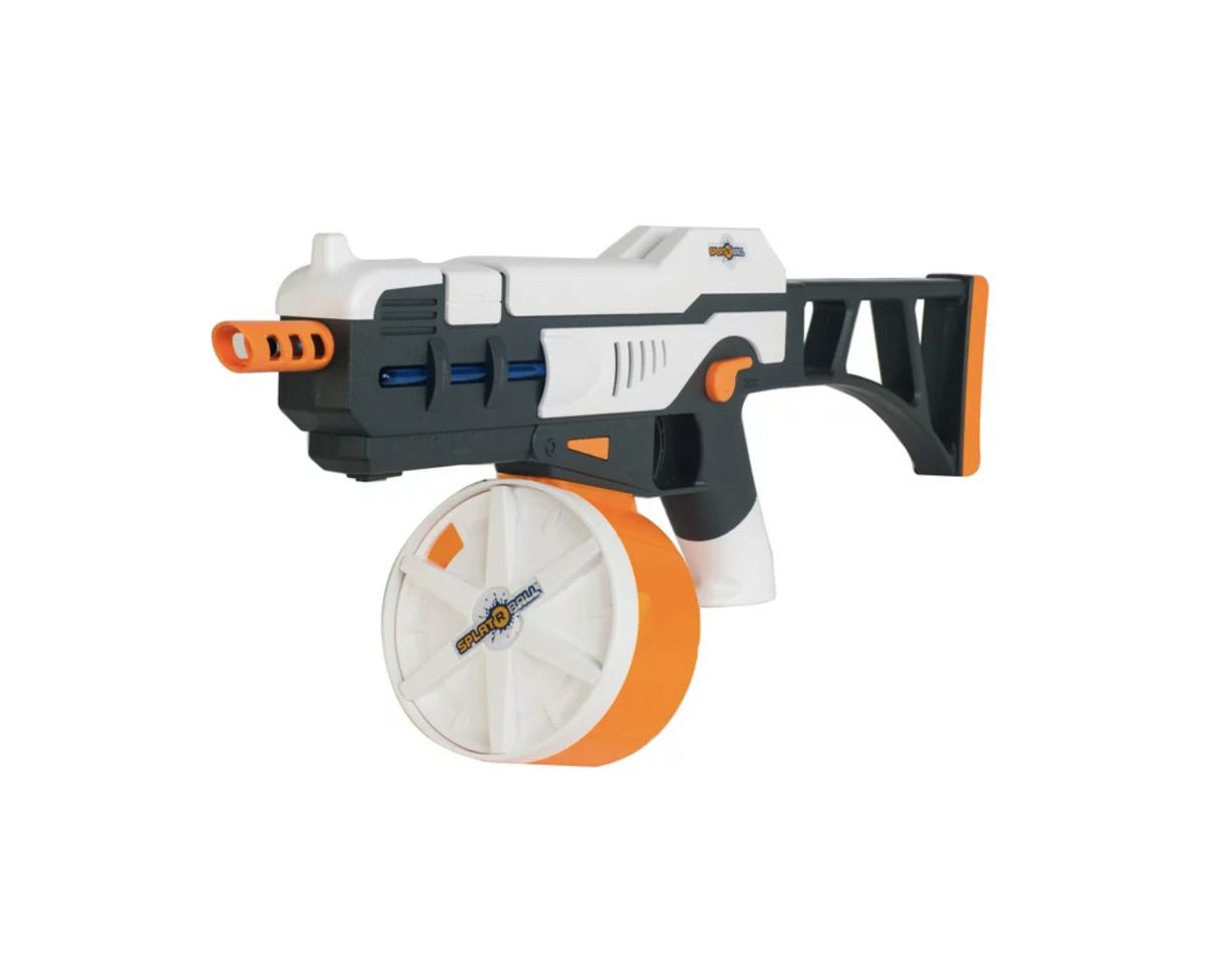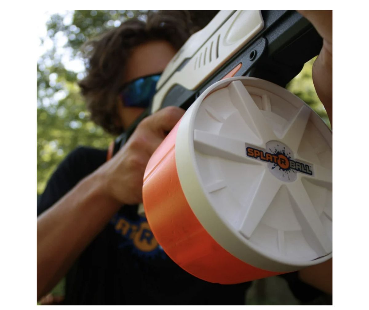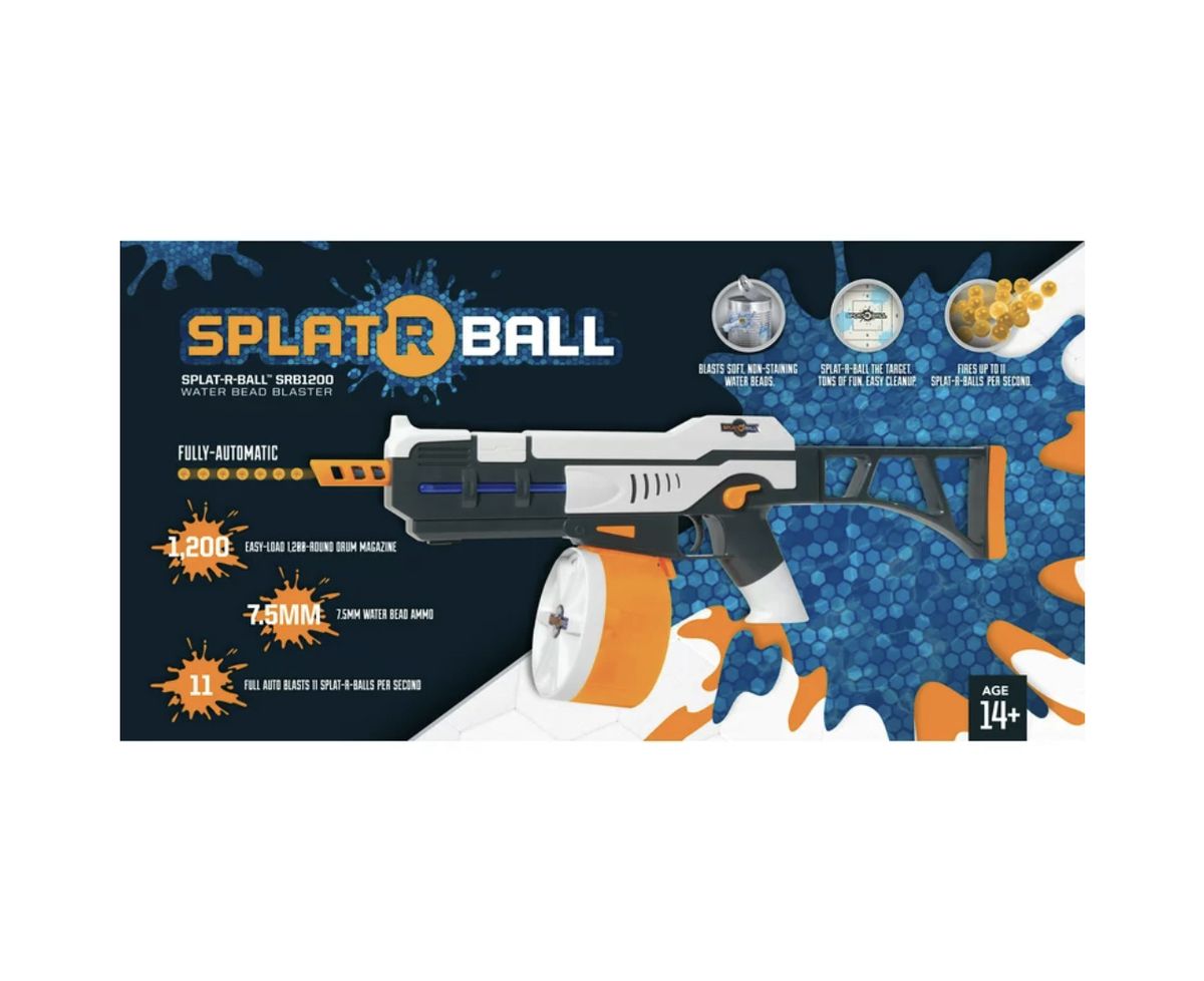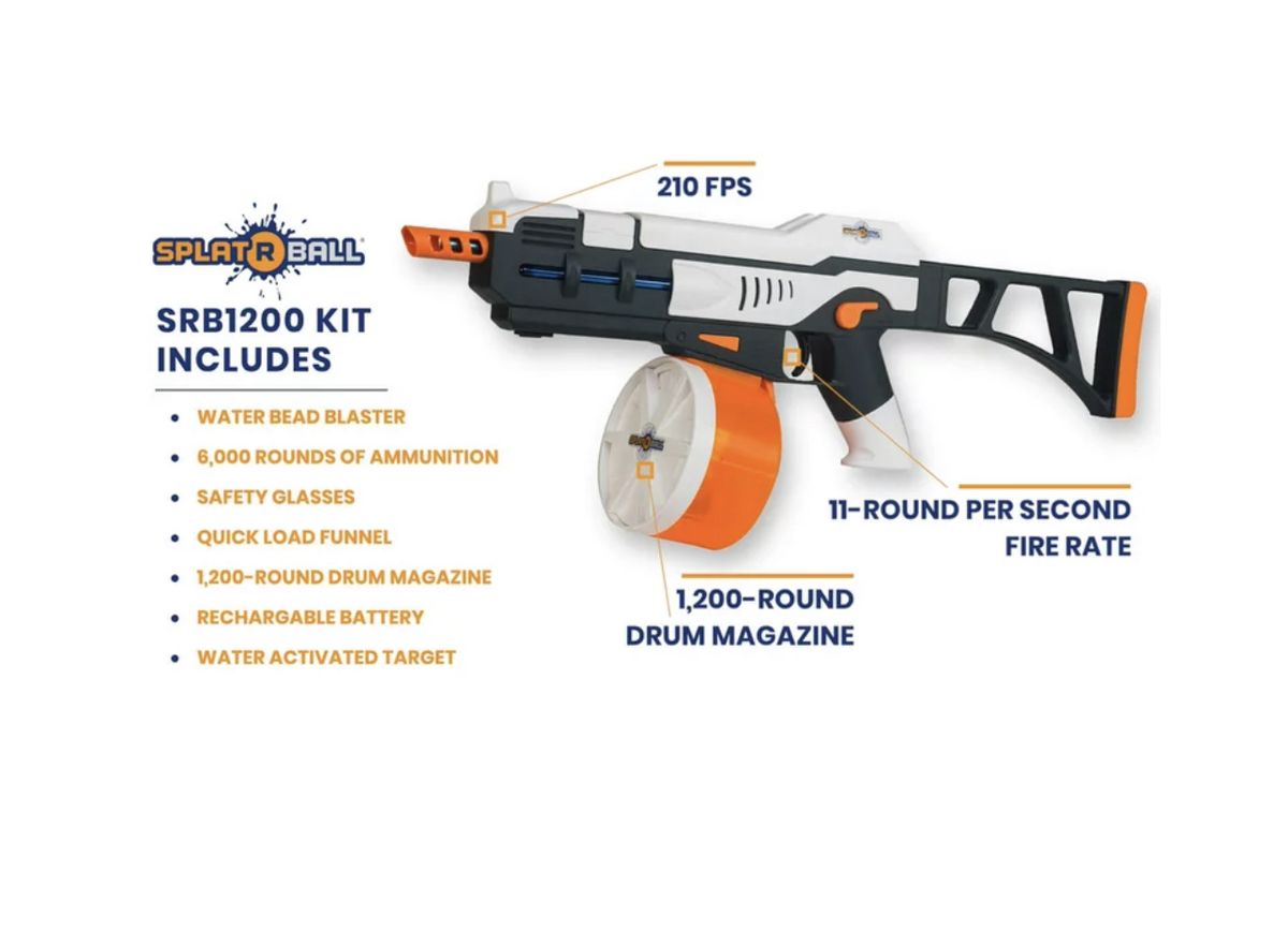 SPLATRBALL everything in your path with full auto water bead fire rate and a 1,200 round drum magazine! The SPLATRBALL SRB1200 Full Auto Water Bead Blaster shoots up to 210 feet per second (fps) SPLATRBALL ammo. It has a drum magazine with 1,200 round capacity. Shoots Certified 7.5mm SPLATRBALL water bead ammo at fire rate. This kit contains one Blaster, 1,200 round drum magazine, detachable stock, 6,000 rounds of SPLATRBALL water beads, rechargeable 7.4V 1800mAh battery with charging cable (up to 5,000 shots per battery charge), SPLATRBALL® collapsible funnel for magazine quick loading, safety glasses and one water activated target. Video: https://www.youtube.com/watch?v=cmpgH9qwY_0 For Support and Customer Service please visit https://splatrball.com/support/