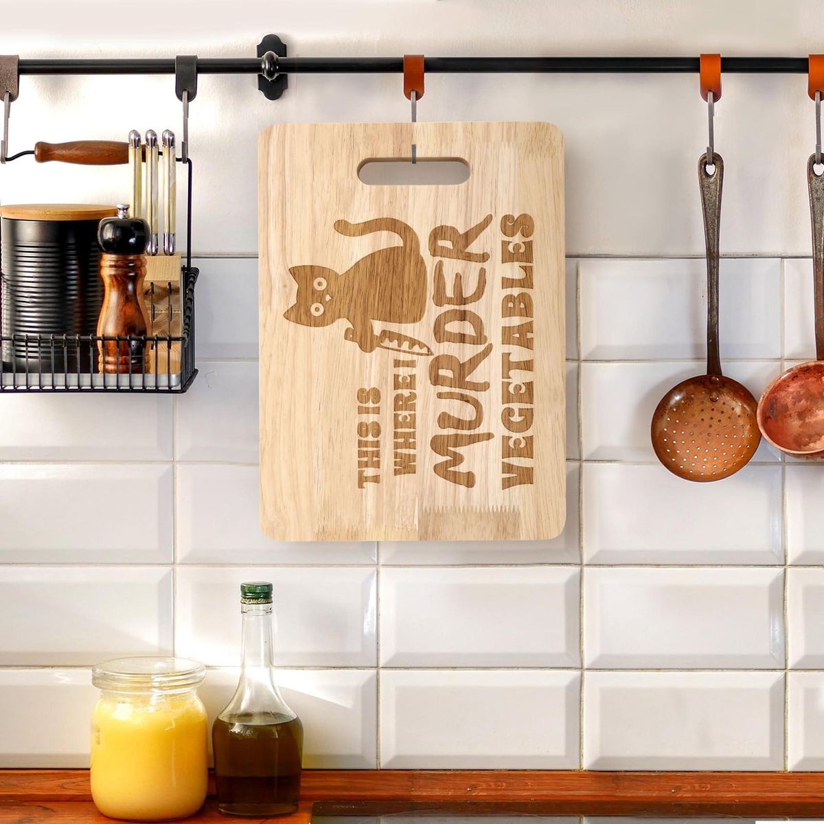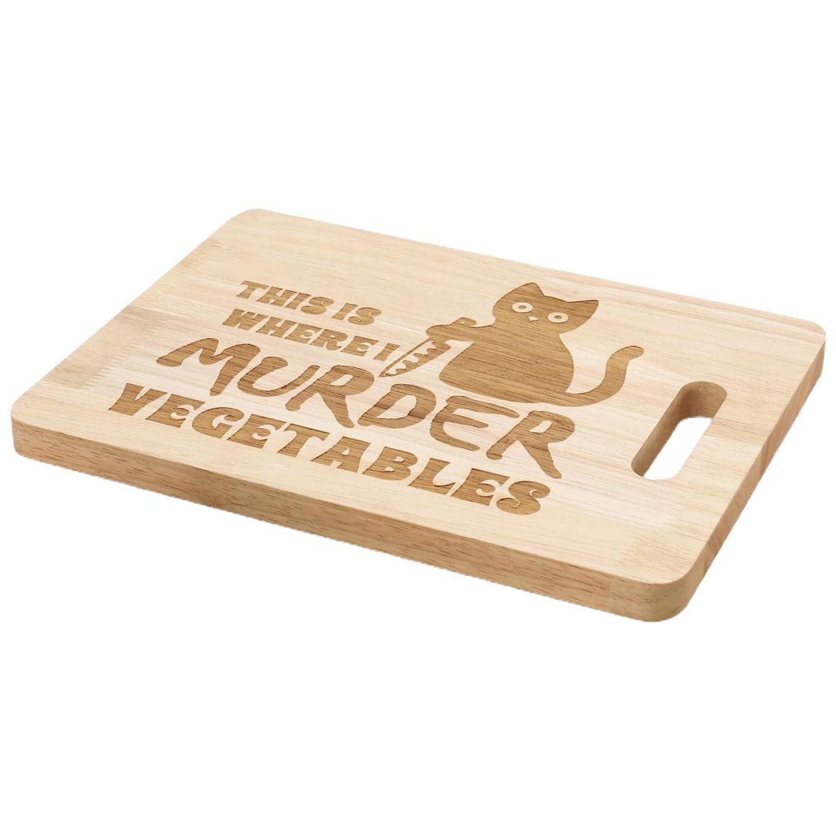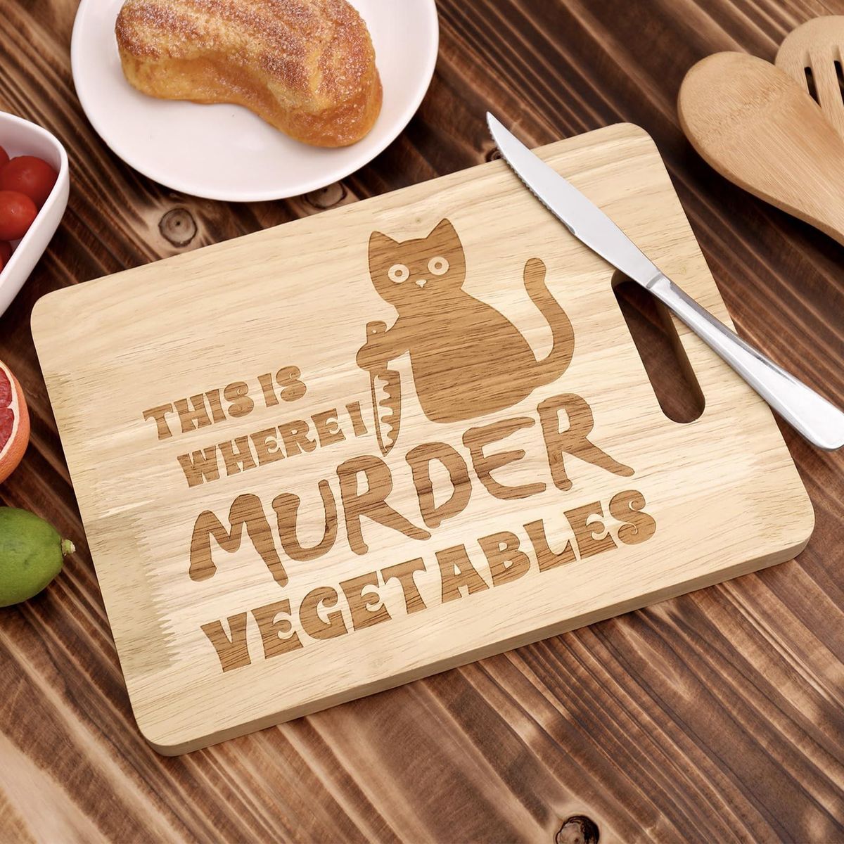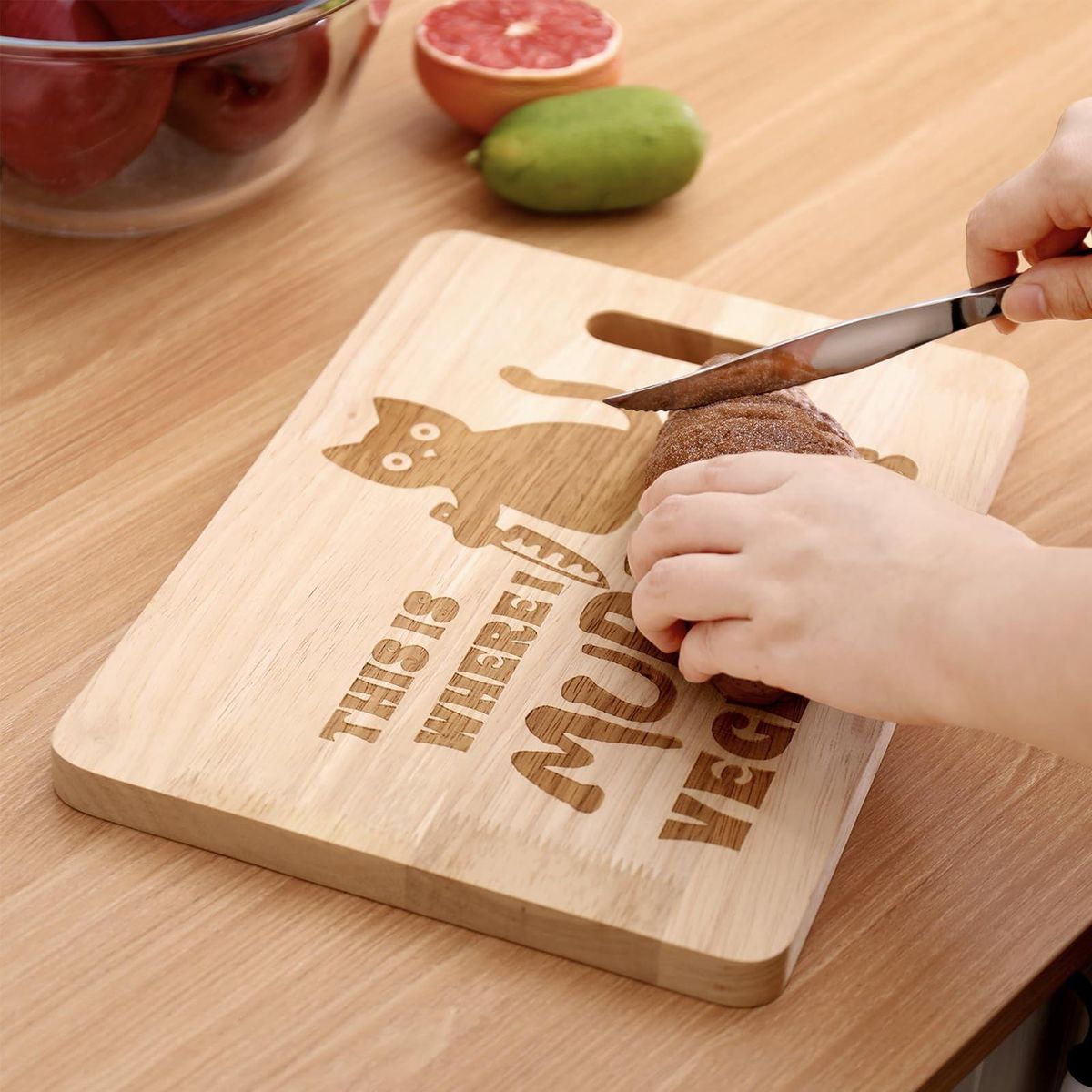 Our adorable and functional wooden cat cutting board! crafted from high-quality hard wood, this cutting board is not only a great kitchen decor but also a practical cooking tool. the eye-catching engraving of a cute cat with a cutter pattern and stylish fonts on one side adds a touch of charm to your kitchen.