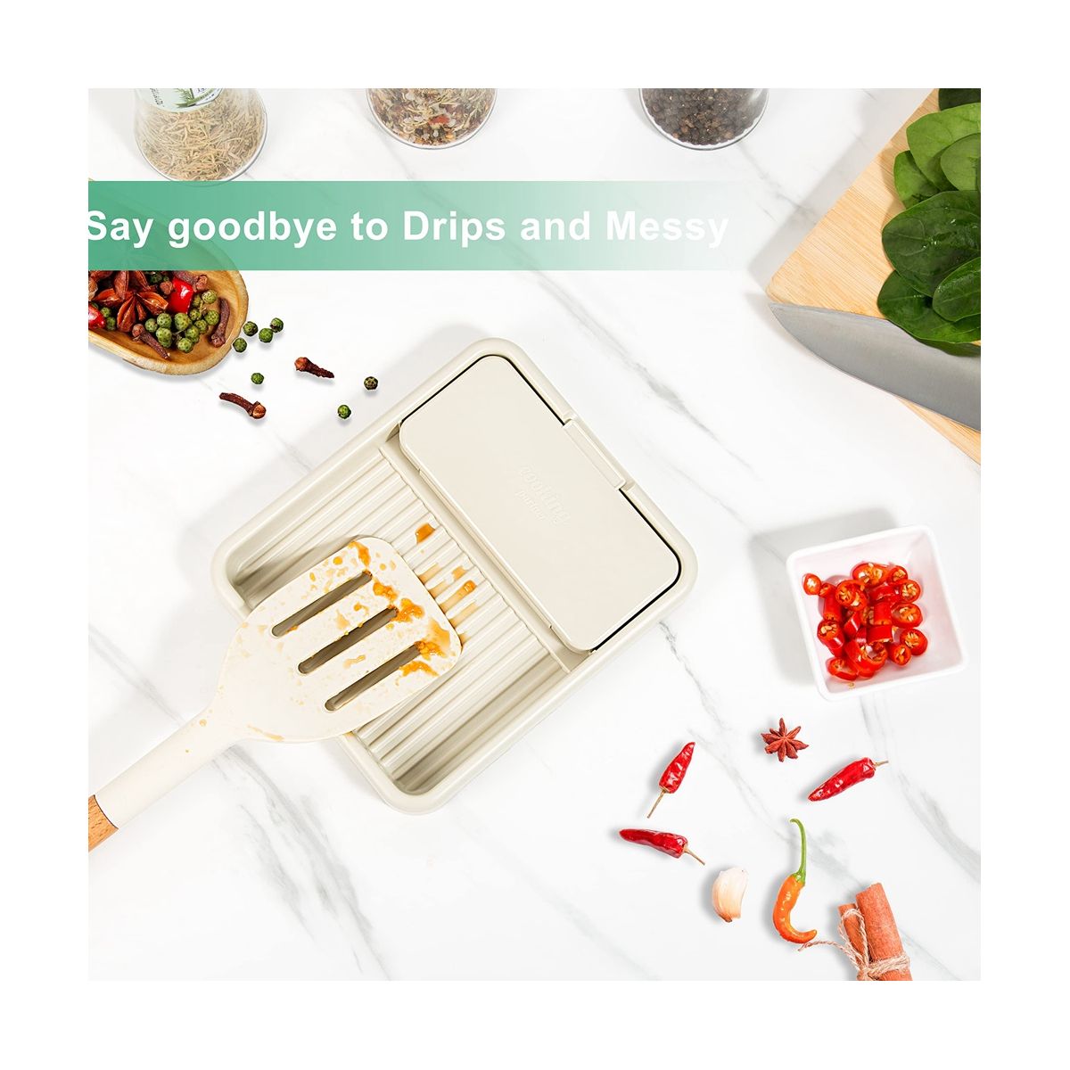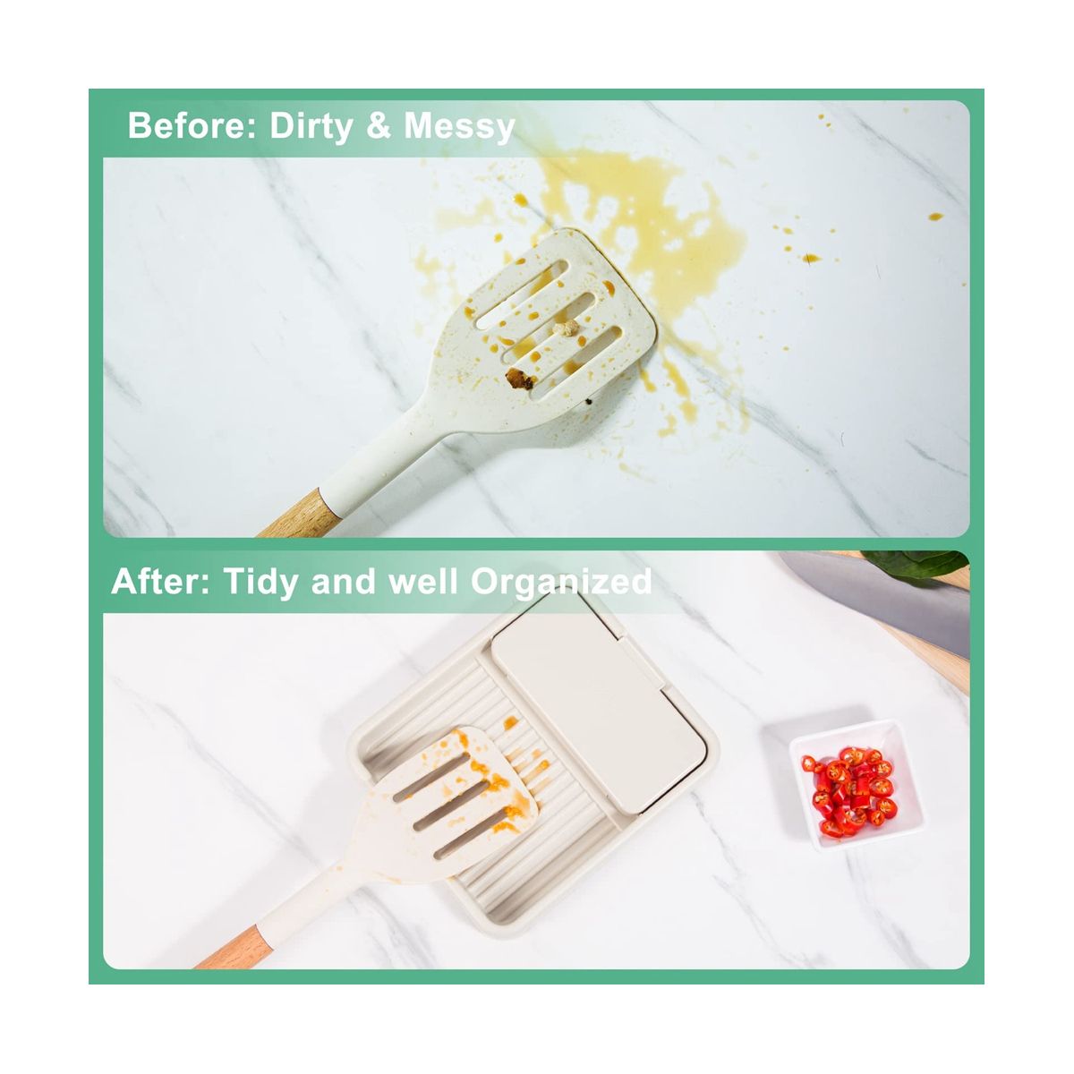 [No Messy, no drips] This kitchen gadgets works perfect for holding the kitchen utensils, such as spoons, ladles, spatulas, tongs, or pot lid on kitchen counter, countertop or while you are cooking or eating, can keep the oil, sauce or drips from your counter. No Messy, no drips from using this utensil rest.