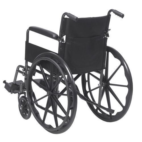 Powder coated silver vein steel framePadded armrestsNylon upholstery is durable, lightweight, attractive, and easy to cleanUrethane tires mounted on composite wheels provide durability and low maintenanceComes with push-to-lock wheel locksCarry pocket on backrest provides additional conveniencePlastic foot platesWeight Capacity 300 lbsFolding back canes for transport and storageOverall Product Length: 43.5"Overall Product Height: 36"Primary Product Material: SteelPrimary Product Color: BlackClosed Width: 11"Seat Width: 18"Seat Depth: 15.75"Seat To Floor Height: 19.5"Back Of Chair Height: 16"Number Of Wheels: 4Seat To Armrest Height: 8"Armrest Length: 10"Armrest To Floor Height: 27.5"Rear Wheels: 24" X 1"Brakes: Push To Lock Wheel BrakesCasters: 8"Folded Dimensions: 43.5" X 11" X 30"Overall Length W/ Riggings: 43.5"Wheelchair Weight Without Riggings: 33.9 LbsProduct Weight Capacity: 300 LbsActual Product Weight: 37.6 LbsOverall Product Width: 24"