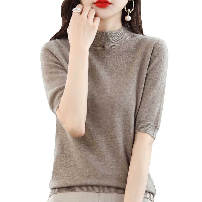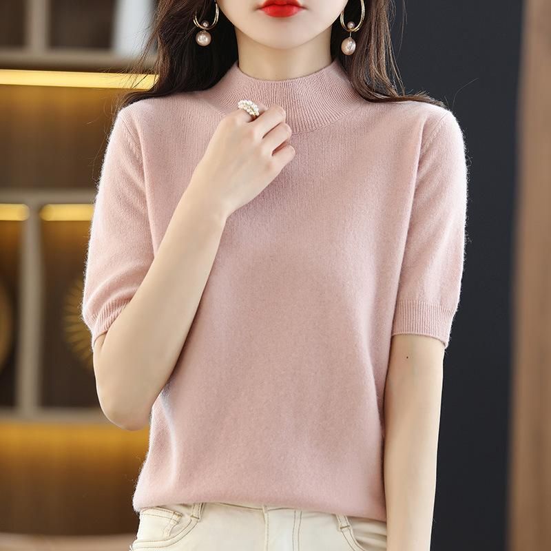 Buy Spring and summer loose all-match wool knitted short-sleeved women's large size round neck solid color bottoming shirt knitted T-shirt thin section Fog blue XL in Nigeria