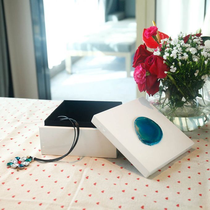 Special design: This is a concise and modern square jewelry box. On the top of the jewelry box, there is decorated with a natural agate in primitive colors.