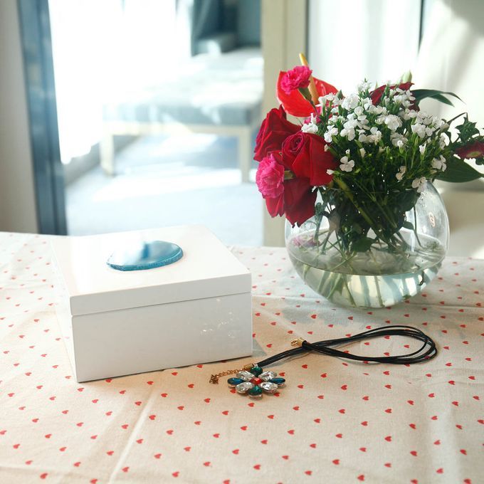 This is a concise and modern square jewelry box. On the top of the jewelry box, there is decorated with a natural blue agate, which seems bright and sets sturdily. Inside the jewelry box is a piece of black velvet to protect the jewelry.